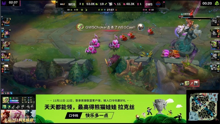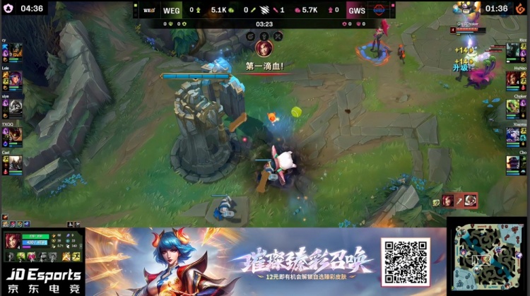 [20:59]河道友浩婕拉又被宸宇奥拉夫贴脸逮捕,Cryin潘森跳大来下落地逮捕宁王泽丽,宸宇奥拉夫再拿一个人头,上路米勒铁男拉xiye飞机进轮回绝境,米勒走位技能全吃被xiye飞机单杀。WEG经济领先5k。
