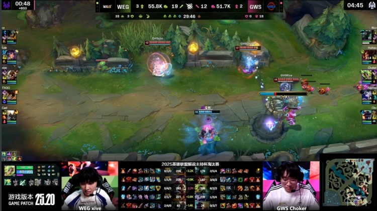 [25:35]中路团战双方辅助互换,随后xiye飞机TP下来单杀友浩婕拉,随后WEG拿到厄塔汗,但xiye没闪河道被GWS逮捕送出大人头。