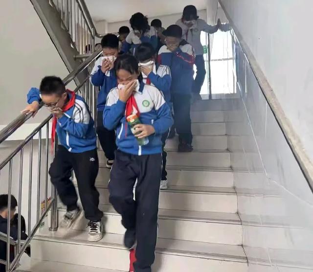 “呜——呜——”上午10点,模拟火警信号准时响起,消防疏散演练正式启动。各班主任立即组织学生用毛巾捂住口鼻,低姿弯腰、快速有序向安全区域撤离。