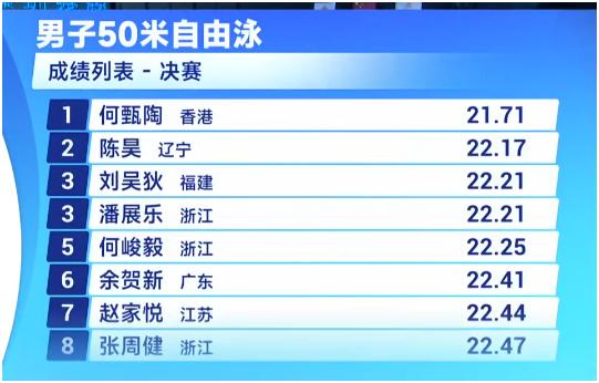 下图是全运会女子50米蝶泳、男子50米决赛8人成绩。 截止目前, 张雨霏获得了50米蝶泳金牌,100米蝶泳金牌,200米蝶泳铜牌。 潘展乐获得了50米自由泳铜牌,100米自由泳金牌,200米自由泳铜牌。