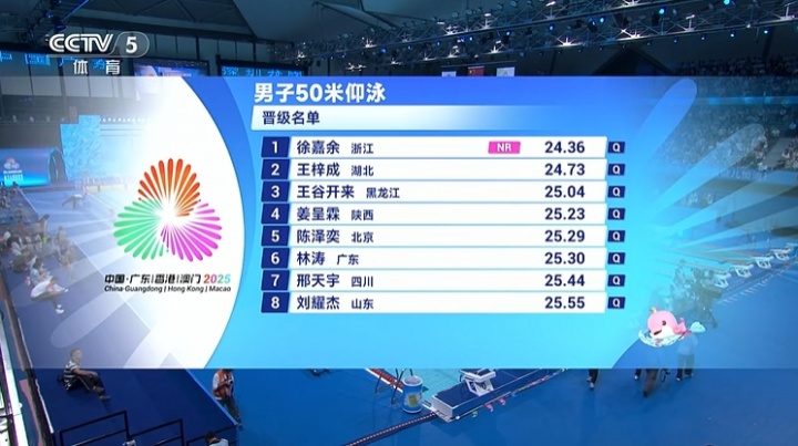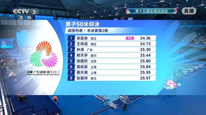 全运会男子50米仰泳半决赛:徐嘉余24秒36打破全国纪录