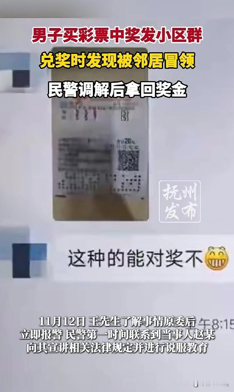 鬼迷心窍! 近日在内蒙古,一名男子买彩票中了奖,兴奋不已的他迫不及待地将彩票拍照,分享到业主群里炫耀。 另一男子赵某看到后顿生邪念,他把微信群里的彩票图片截图发给彩票站老板,声称这是自己的中奖彩票。因自己在外地,便要求老板将中奖金额通过微信转给自己。 按照规定,兑奖必须持实际中奖的彩票。然而,彩票站老板考虑到赵某是本彩票站的老彩民,且中奖金额不大,便通过微信将钱转给了赵某。 真正中奖的男子拿着彩票去兑奖时,彩票站老板却告知他奖金已被人领走。 于是,男子报了警。警察经过调查,找到了冒领者赵某。赵某承认自己一时鬼迷心窍犯了错,将冒领的金额如数退还,中奖男子也原谅了他。由于金额不大,警察未对赵某作出处罚,但对他进行了批评教育。 这件事提醒大家,不要动不动就在几百人的微信群里晒可能暴露自己重要信息的图片,尤其是涉及钱财的事。 无论是发朋友圈还是微信群,发之前一定要三思。 不管是自己发了财还是升了职,自己知道就好,别到处炫耀。做人还是低调些为好!