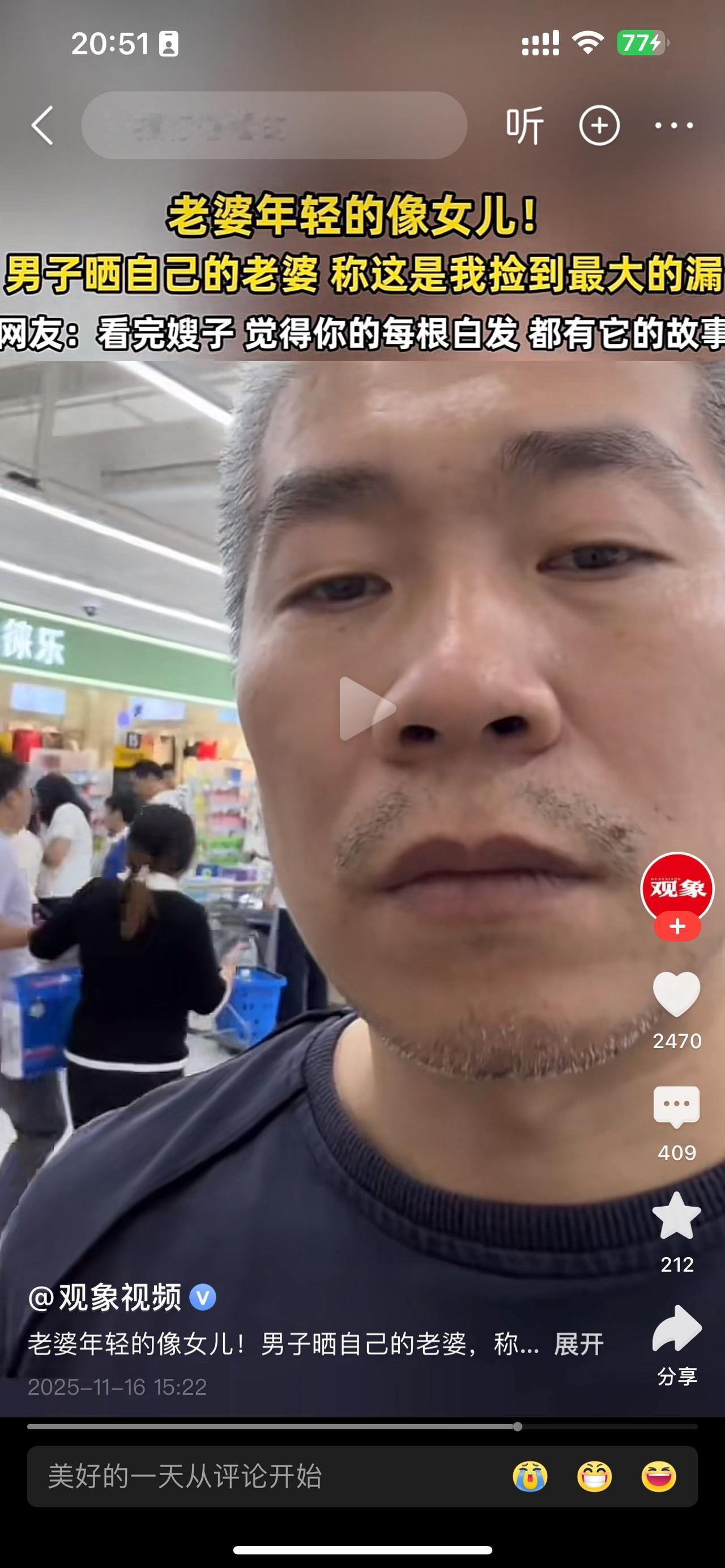 你看看人家大哥的老婆像女儿,你在看看我的女儿像老婆,老天到底怎么了,大哥是有什么样的福气,可以娶到如此优秀的老婆,大哥在哪里发财啊。 大哥一看就是有实力的,大哥头发花白,一看就是个小老头,可是大哥的老婆就是那么美丽动人,跟我的初恋女友很像,真的可惜大嫂子了。