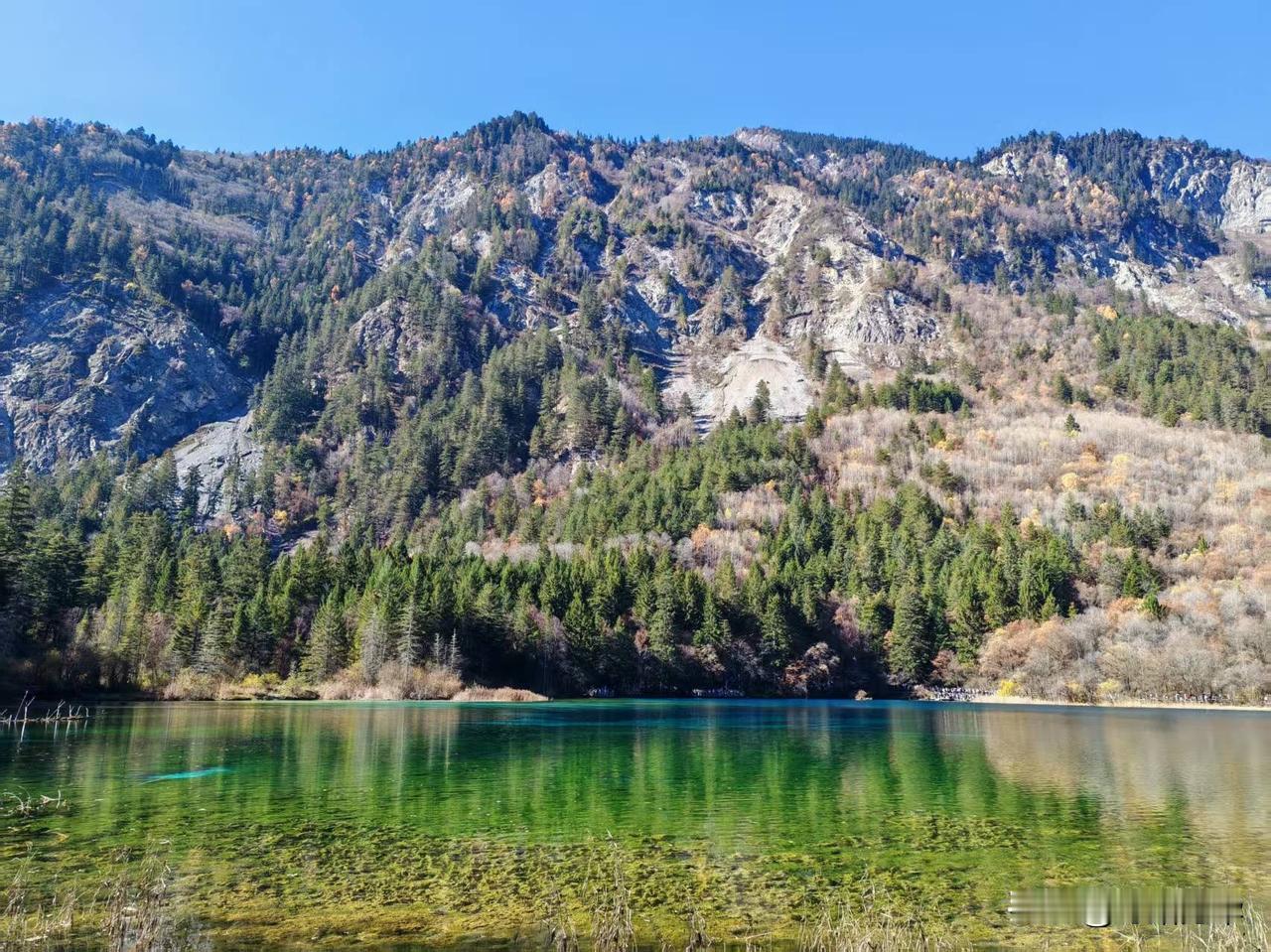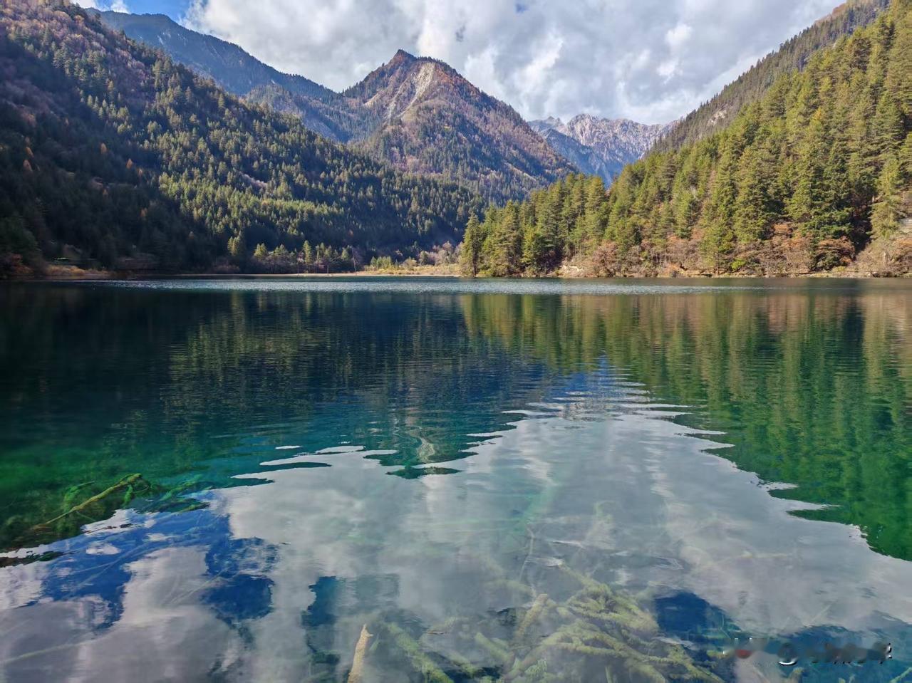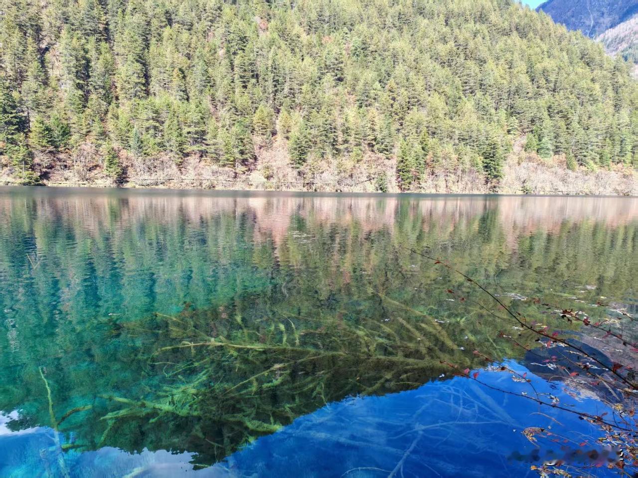 2025年11月16日九寨沟淡季的第一天。昨天的风雪还留在记忆里,今晨却是一片澄澈如洗的碧空。 沿着栈道徐行,目光便不由自主地被那一片片海子攫了去。这时的水,仿佛比任何时节都更要沉静、更要通透。天上一整块完整的、蔚蓝的绸缎,连同几团闲闲散步的云絮,都倒映在这片澄澈的镜面之中。 水底那些静卧了千百年的树珊瑚,轮廓清晰,仿佛一伸手便能触到那钙化的、岁月的骨骼。水色是奇幻的,孔雀蓝、松耳绿,还有些说不清道不明的颜色,交织在一起,像一汪流动的、温润的玉。 视线放远些,便是层叠的山林了。夏日里一味泼辣的浓绿已然褪去,此刻的山,是一幅用尽了暖色调的画卷。深红、浅赭、金黄、苍绿,一簇簇,一片片,彼此浸润着,交错着,是山神打翻了调色盘。这斑斓的彩林,也一并落入海子的怀抱,于是,水底便有了另一个颠倒的、同样绚烂的世界。真与幻,实与虚,在这一刻,竟叫人有些分辨不清了。 这初冬的九寨,它不像春夏那般喧闹逼人,也不似深冬那般凛然不可犯,它只是静静地、温和地,在一年将尽之时,为你铺开这样一幅静谧而丰饶的画卷。