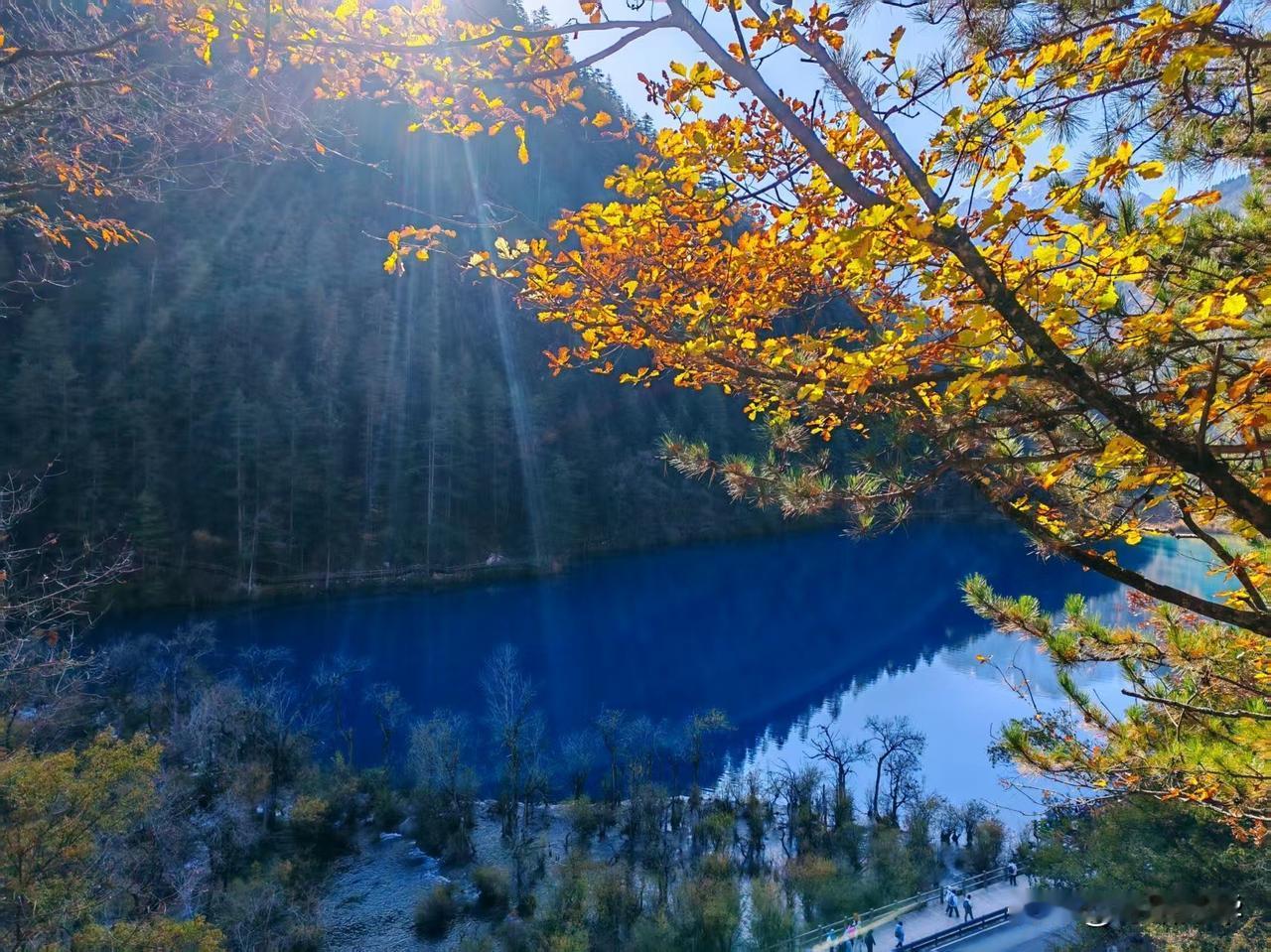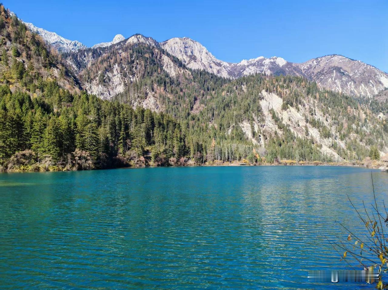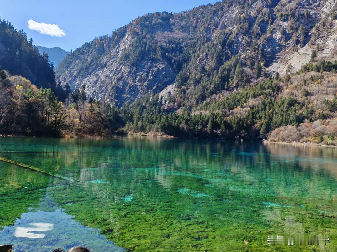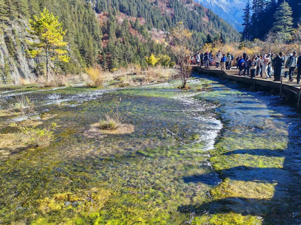 2025年11月16日九寨沟淡季的第一天。昨天的风雪还留在记忆里,今晨却是一片澄澈如洗的碧空。 沿着栈道徐行,目光便不由自主地被那一片片海子攫了去。这时的水,仿佛比任何时节都更要沉静、更要通透。天上一整块完整的、蔚蓝的绸缎,连同几团闲闲散步的云絮,都倒映在这片澄澈的镜面之中。 水底那些静卧了千百年的树珊瑚,轮廓清晰,仿佛一伸手便能触到那钙化的、岁月的骨骼。水色是奇幻的,孔雀蓝、松耳绿,还有些说不清道不明的颜色,交织在一起,像一汪流动的、温润的玉。 视线放远些,便是层叠的山林了。夏日里一味泼辣的浓绿已然褪去,此刻的山,是一幅用尽了暖色调的画卷。深红、浅赭、金黄、苍绿,一簇簇,一片片,彼此浸润着,交错着,是山神打翻了调色盘。这斑斓的彩林,也一并落入海子的怀抱,于是,水底便有了另一个颠倒的、同样绚烂的世界。真与幻,实与虚,在这一刻,竟叫人有些分辨不清了。 这初冬的九寨,它不像春夏那般喧闹逼人,也不似深冬那般凛然不可犯,它只是静静地、温和地,在一年将尽之时,为你铺开这样一幅静谧而丰饶的画卷。