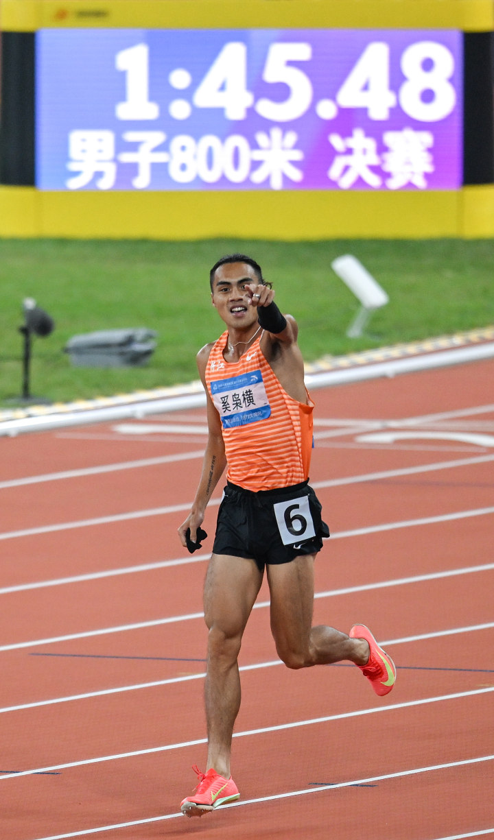 起跑奚枭横步频稳健地迅速切入内道,凭借出色的卡位意识始选择紧跟在前几名之后,前400米他稳稳控制自己的位置,后400米赛道竞争骤然白热化,选手相继提速发起冲击,奚枭横加大步幅上演连续超越,在最后时刻逆转对手冲过终点线,计时器定格在1分45秒48,奚枭横刷新了个人最好成绩并打破全国纪录夺金,成为本届全运会田径赛场诞生的首个全国纪录获得者。