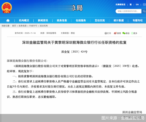 走过十年,互联网银行中的“老大哥”微众银行新帅即将上任。11月16日,北京商报记者注意到,据金融监管总局官网行政许可信息,深圳金融监管局核准了黄黎明深圳前海微众银行(以下简称“微众银行”)行长的任职资格。
