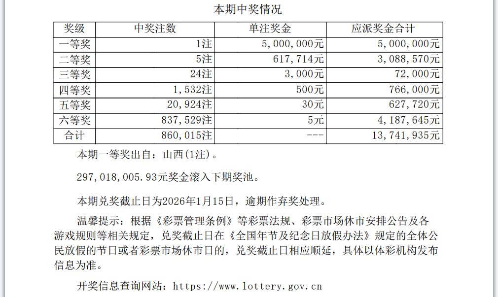 11月15日体彩中奖号码 7星彩开出1注一等奖