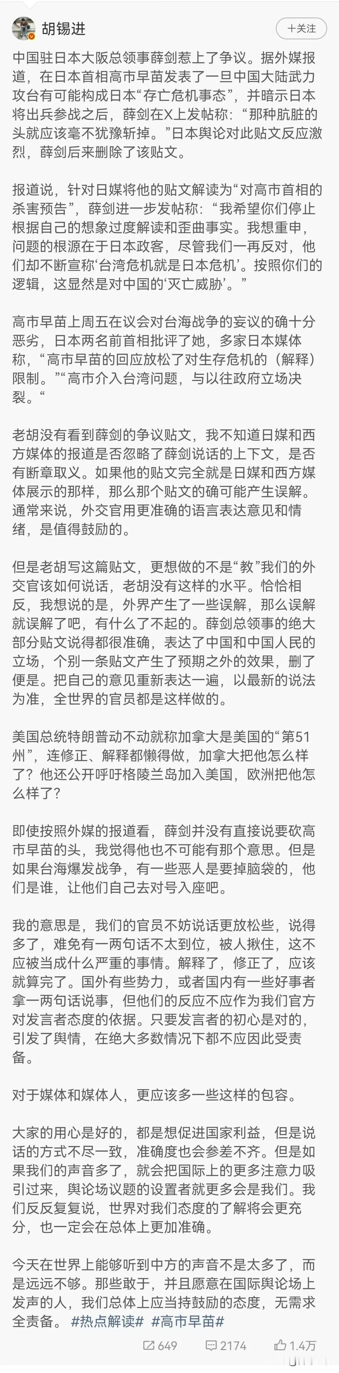 胡锡进以美国总统特朗普的大嘴巴为例,我就说了,你能把我怎么样? 胡锡进的一篇关于“中国驻日本大阪总领事薛剑惹上了争议”中,引用了美国总统特朗普的大嘴言论,说美国总统特朗普动不动就称加拿大是美国的“第51州”,连修正、解释都懒得做,加拿大把他怎么样了?他还公开呼吁格陵兰岛加入美国,欧洲把他怎么样了? 是啊,我就说了,你能把我怎么样?对于胡锡进的这篇文章,反正我看得模棱两可,也不知道他想表达什么?你是怎么理解的?欢迎评论区说说你的意见!