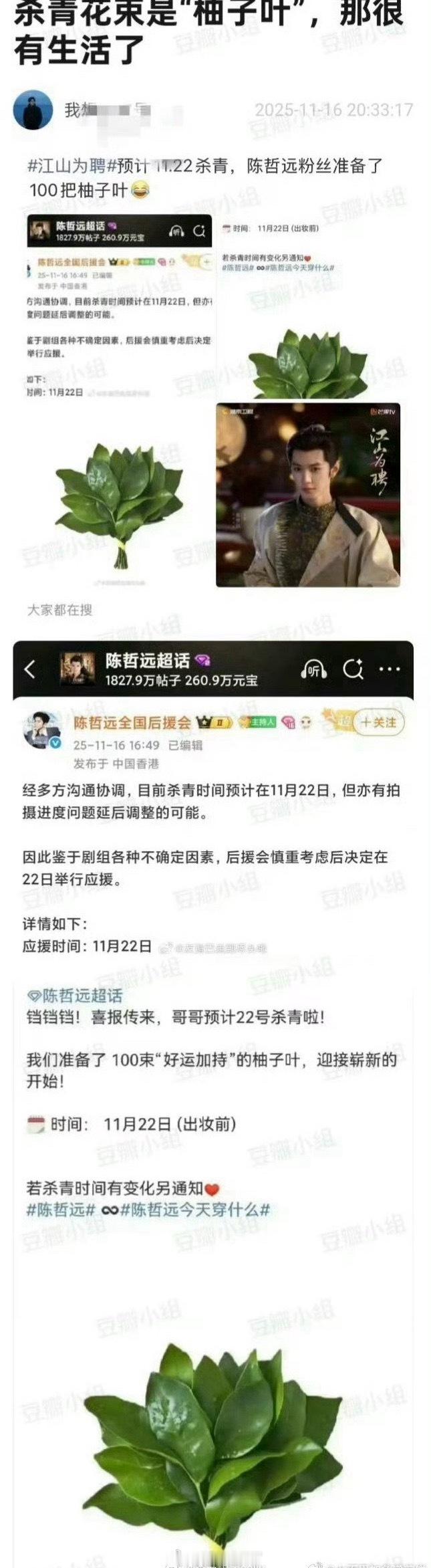 陈哲远粉丝给陈哲远《江山为聘》的杀青礼物是柚子叶…真的很有生活了