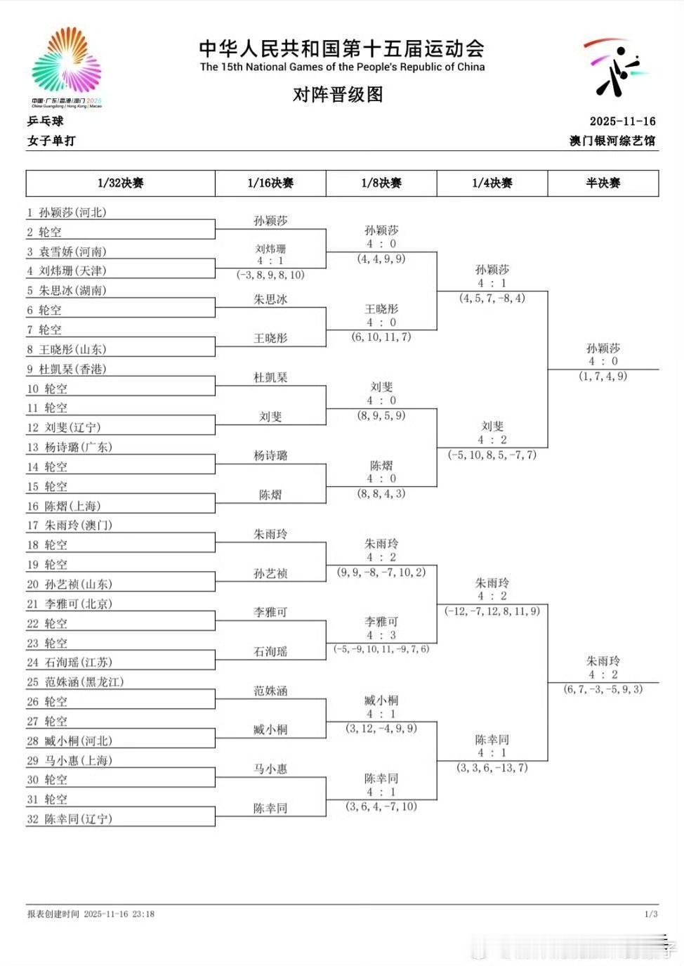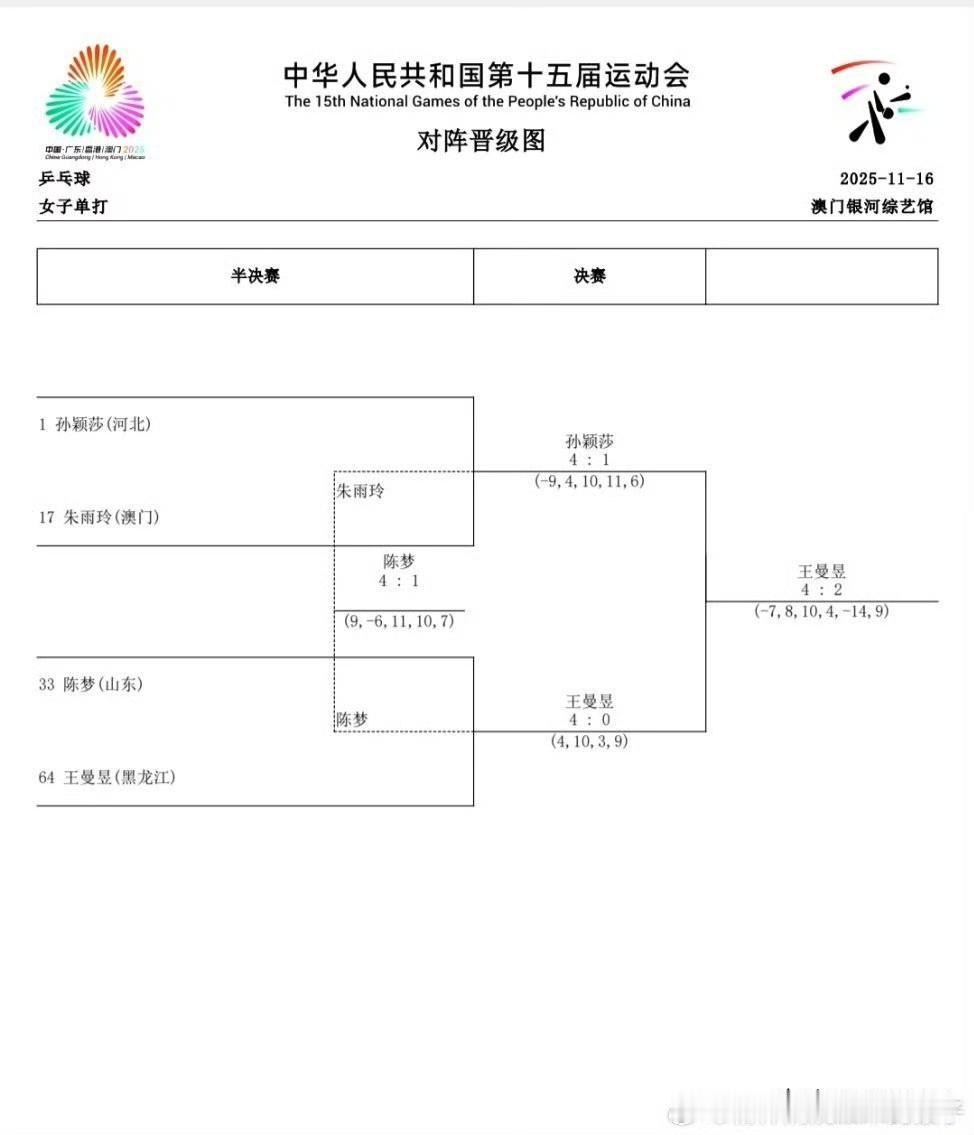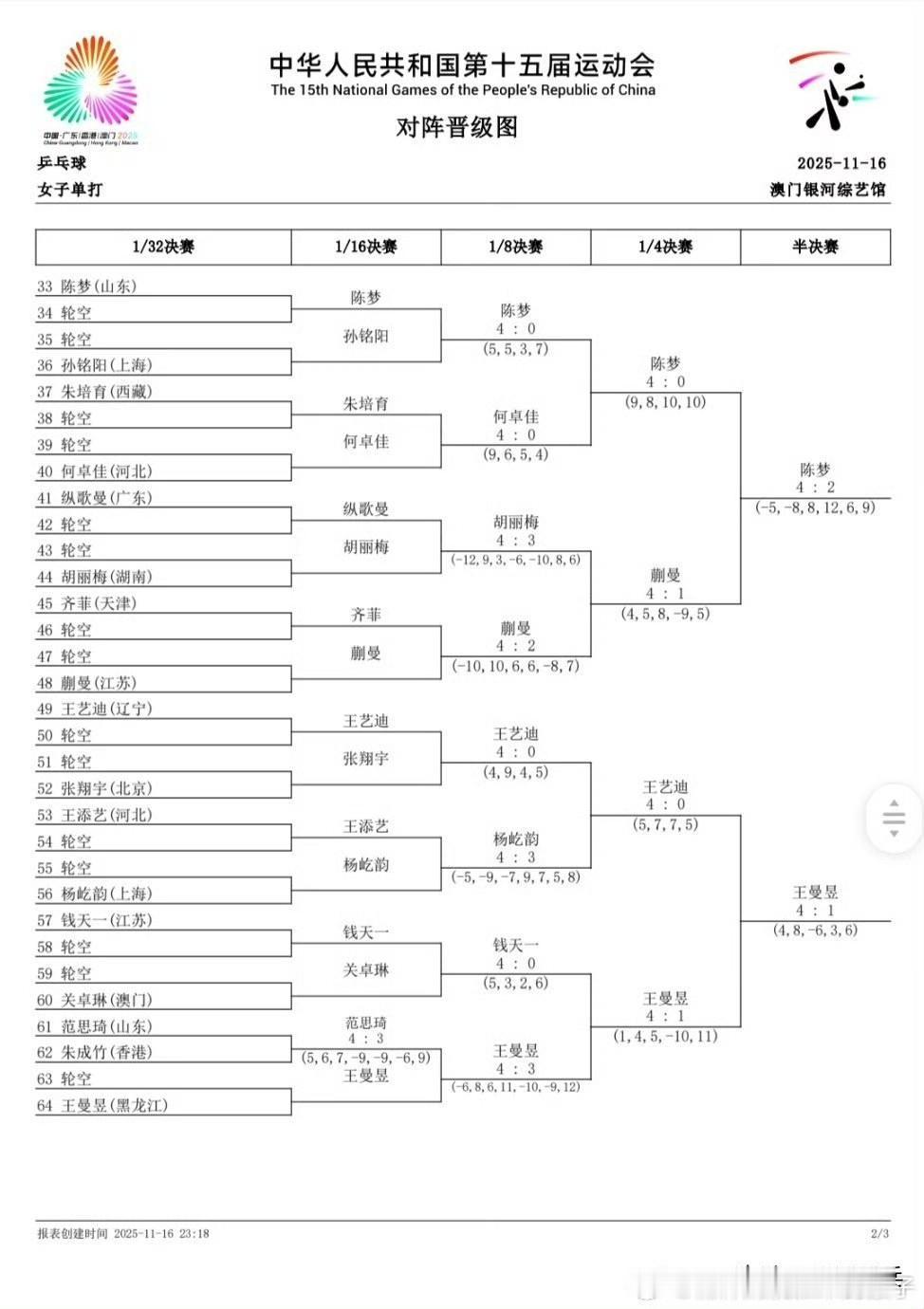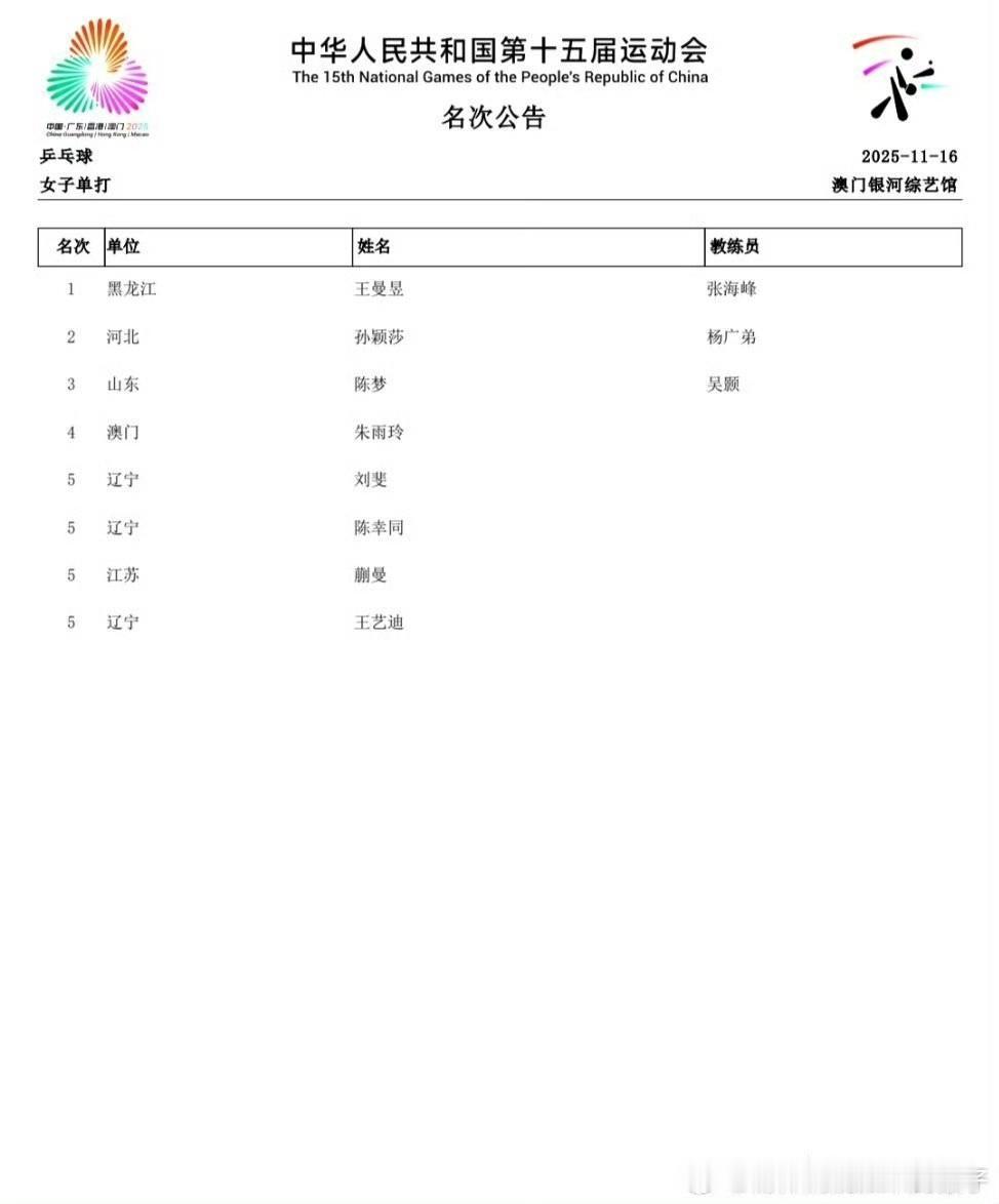 女单项目名次公告:11.16 冠军🥇:王曼昱(黑龙江队)教练:张海峰 亚军🥈:孙颖莎(河北队)教练:杨广弟 季军🥉:陈梦(山东队)教练:吴颢 第四名:朱雨玲(中国澳门队) 第五名:刘斐(辽宁队) 第五名:陈幸同(辽宁队) 第五名:蒯曼(江苏队) 第五名:王艺迪(辽宁队)