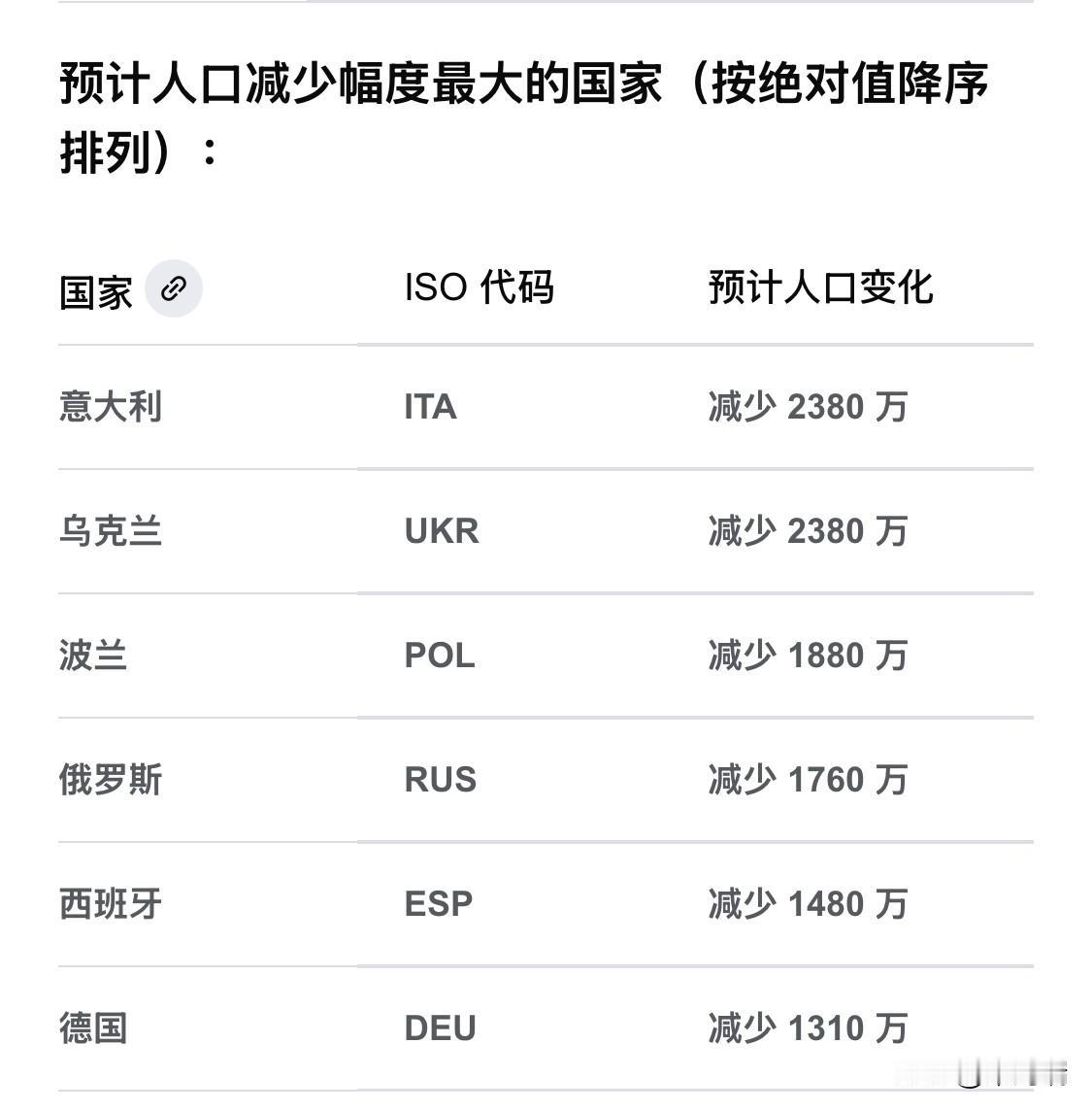 联合国预测,到 2100 年,欧洲人口可能会减少 1.52 亿人。 根据联合国《2024 年世界人口展望》报告预测的 2025 年至 2100 年欧洲人口变化。预测显示,欧洲总人口预计将减少 1.522 亿。 欧洲人口趋势概览 总体下降:大多数欧洲国家的人口预计会下降,原因是生育率长期低于人口更替水平(约 2.1)。欧洲人口在 2020 年左右达到顶峰,此后开始逐步下降。人口降幅最大的地区预计将出现在东欧和南欧国家,如乌克兰、波兰、罗马尼亚、保加利亚和希腊。立陶宛和拉脱维亚的人口预计将下降超过 30%。 例外情况:少数国家预计人口将增长,主要是由于移民因素。 数据来源:这些是基于联合国“中等方案”估计得出的预测,该方案考虑了生育率、死亡率和移民的假设。