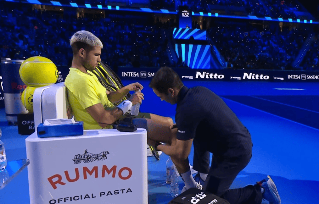 第一盘,阿尔卡拉斯在第9局完成保发后,申请理疗师入场,对大腿进行按摩。