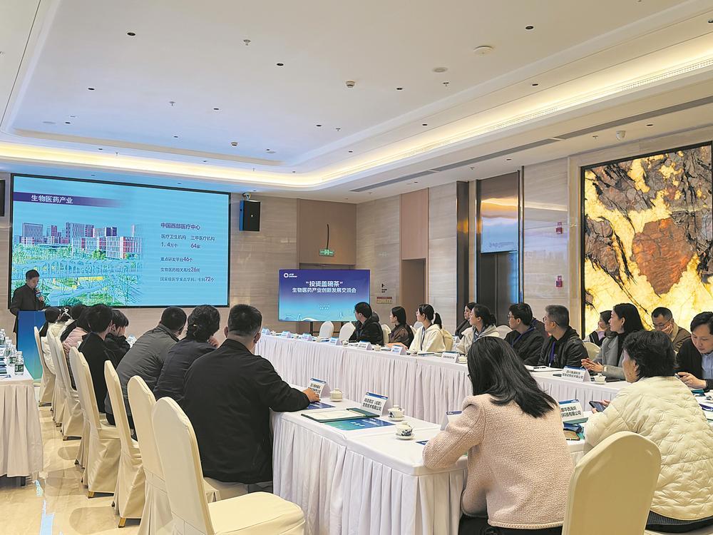 冬日的成都天府国际生物城,依然涌动着创新的热流。11月14日,一场别开生面的“投资盖碗茶”生物医药产业创新发展交流会,将会场直接“搬”进了产业一线——成都海枫生物科技有限公司的实验室与办公区之间。近40家生物医药企业、服务平台、学协会及投资机构的代表,在热烈的氛围中围坐而谈。这里没有刻板的“排排坐”,只有U形桌的“面对面”,政府搭台、企业唱戏,共话生物医药产业创新“药引”。