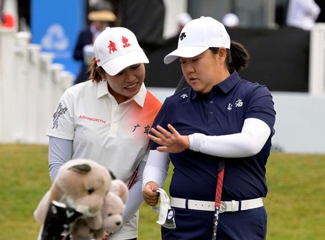 新华社照片,香港,2025年11月14日11月14日,上海队选手刘瑞欣(右)和广东队选手任玥在交谈。当日,第十五届全国运动会高尔夫球赛女子个人赛、团体赛第二轮小组赛在香港粉岭高尔夫球会举行。新华社发(卢炳辉摄)