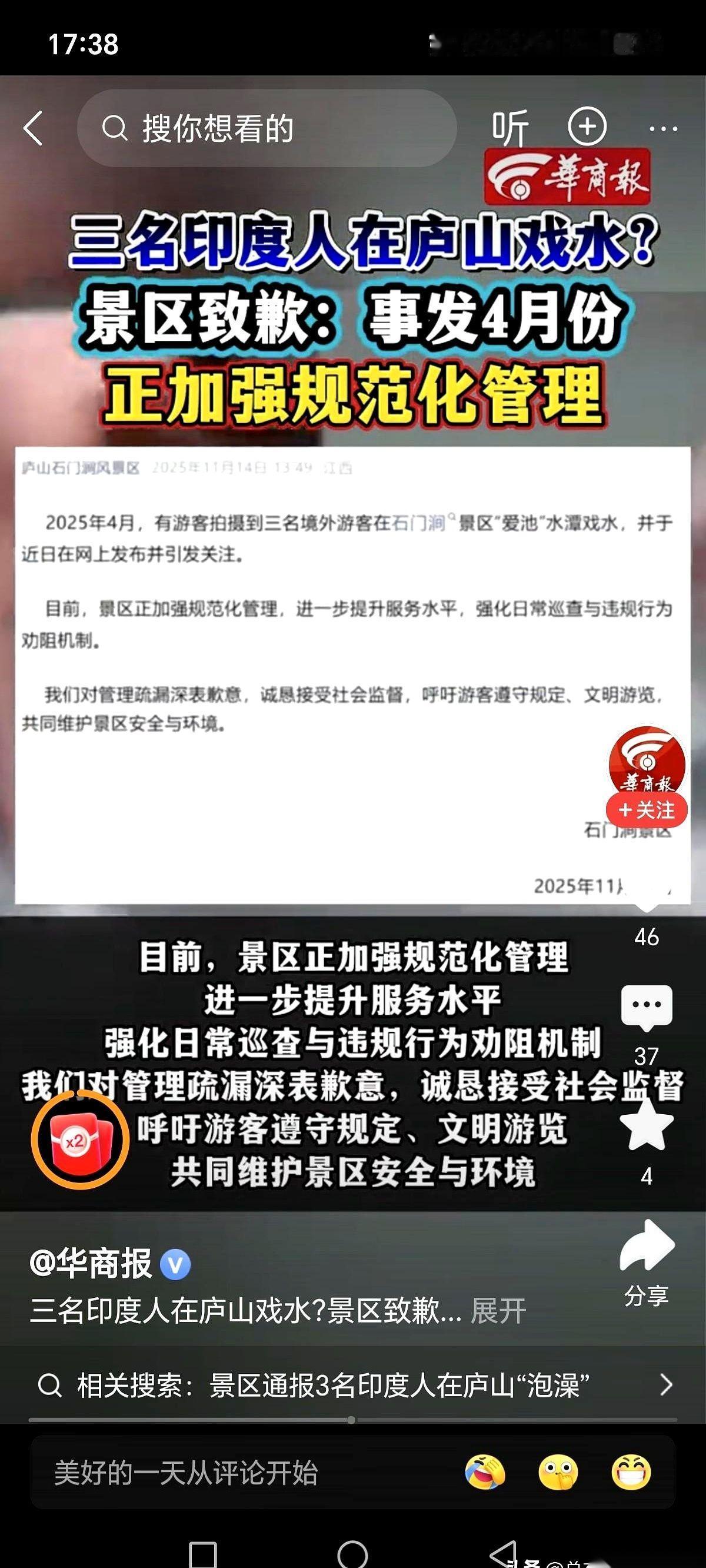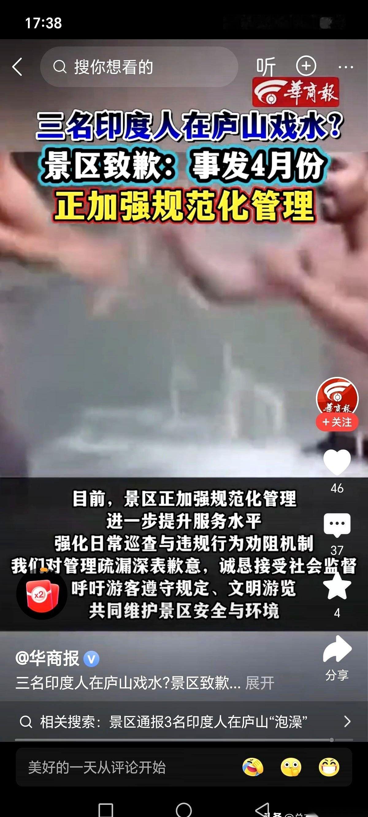 我刷到一个视频,差点没给我气笑了。 几个印度老哥,在庐山清澈见底的溪水里,那脚丫子扑腾得叫一个欢啊。 跟自家后院游泳池似的,自在得很。 这就有点意思了。 我记得我们自己人去玩,别说下水了,就是想伸手捞片叶子,旁边的牌子上都写着“禁止戏水,保护水源”。 有时候扔个垃圾慢了点,都得被巡逻的大爷用眼神教育半天。 怎么的?规矩这东西,还分国籍? 我们小心翼翼呵护的青山绿水,到了别人那儿,就成了免费的“天然足浴盆”? 凭啥? 是他们看不懂中文提示,还是觉得“不知者无罪”这块免死金牌特好用? 我倒不觉得是多大的坏心眼,可能就是一种纯粹的、发自内心的“没拿自己当外人”。 但问题是,你就是外人啊。 来我们家做客,爱护我们家的东西,这是最最基本的礼貌吧。 后来景区回应了,说会加强管理。 嗯,希望吧。 说到底,入乡随俗这四个字,全世界通用。 跟你是哪国人没关系,跟一个人的基本素养,有很大关系。