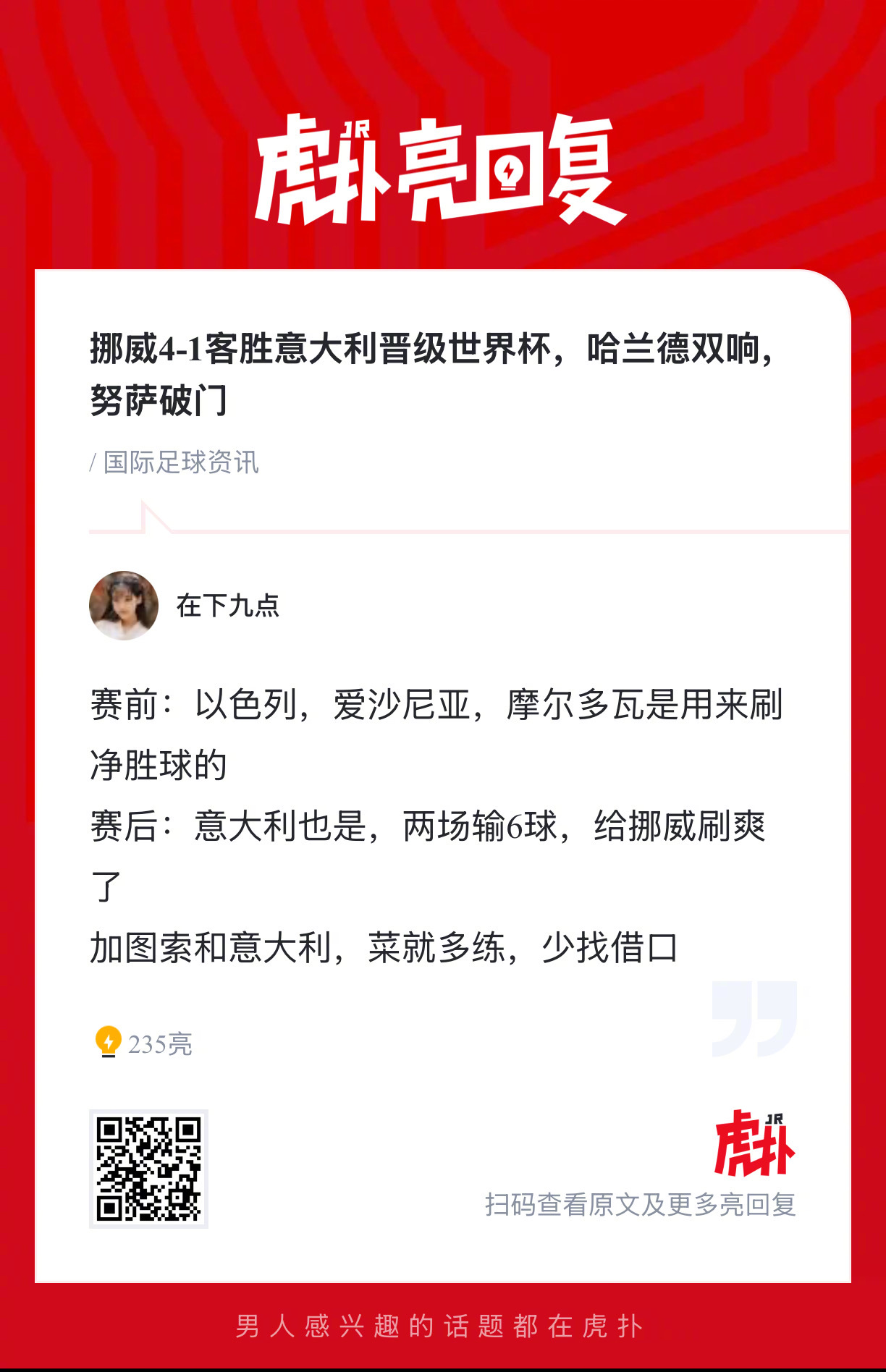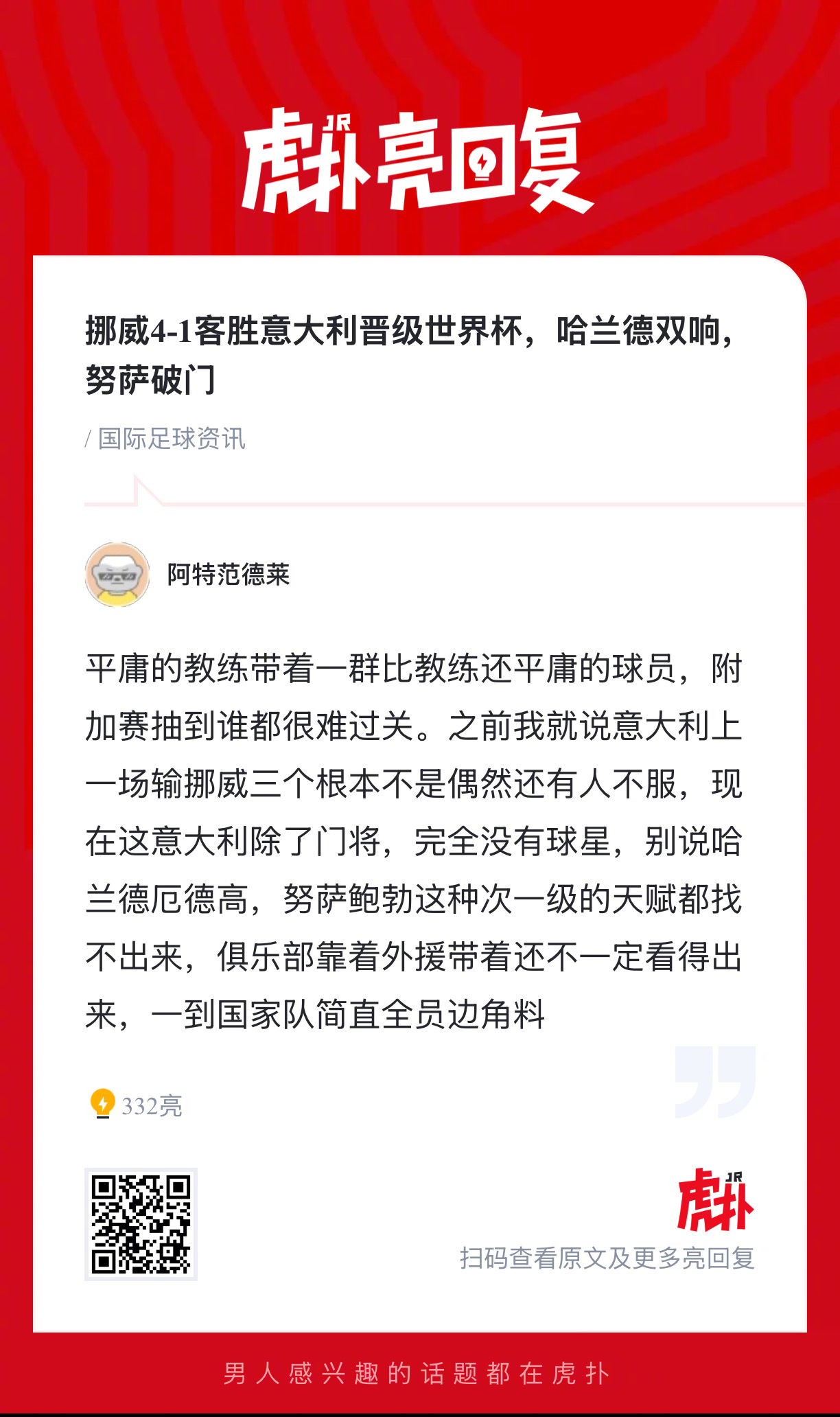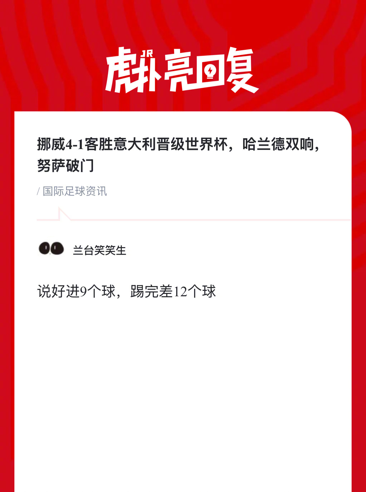 【挪威4-1客胜意大利晋级世界杯,哈兰德双响,努萨破门】上半场迪马尔科抽射造险,埃斯波西托转身破门,随后埃斯波西托头球滑门而出,下半场努萨抽射扳平比分,迪马尔科打门被扑,哈兰德两分钟两球,拉森锁定胜局。
