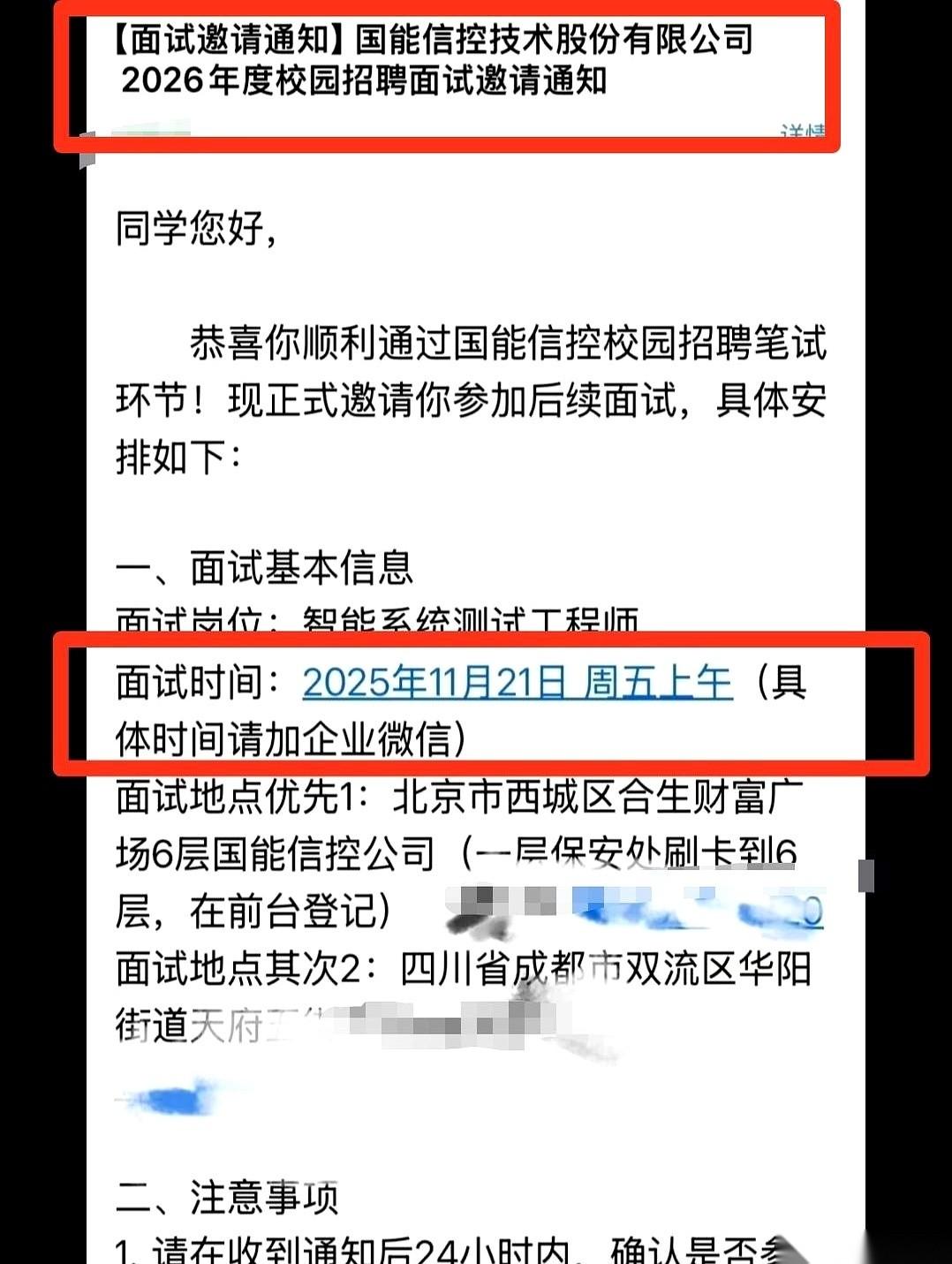 真的,就今天,手机一亮,国能的面试通知就砸过来了。 悬了几个月的心,总算能稍微放一放了。 不得不说,国能还是讲究。信控那边直接给了北京、成都两个点让你选,就冲这细节,这波必须给个赞。不像有些厂,天南地北就一个地方,去不去吧,你自己看着办。 但是,先别光顾着高兴。 这节骨眼上,最怕的就是自己掉链子。 跟你说几句大实话: 国能那么大,下边单位几百个,人家发通知的节奏根本不一样。你同学收到了你没收到,太正常了,别自己先慌了神。 还有,现在通知形式五花八门的,短信、邮件、APP站内信……都给我翻个底朝天!尤其是垃圾箱,每年都有在这种地方翻出“命运”的幸运儿(或者说马大哈)。 收到信儿了,让人家啥时候回复、加群、确认,麻利儿的!别拖!你以为你是谁啊,还等着HR三顾茅庐吗?机会从来都是给有准备、还手快的人。 笔试那道大门槛你都迈过去了,多不容易。 临门一脚,自己可千万别踢飞了。