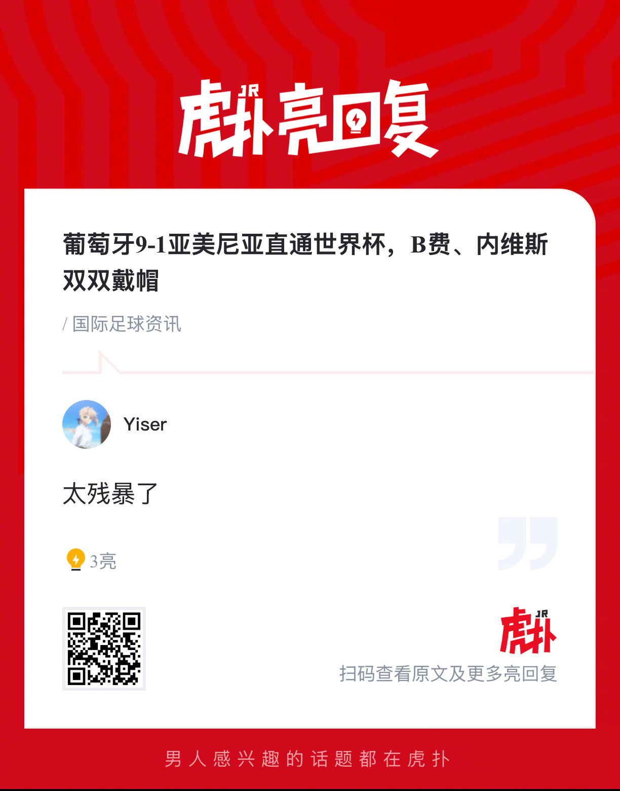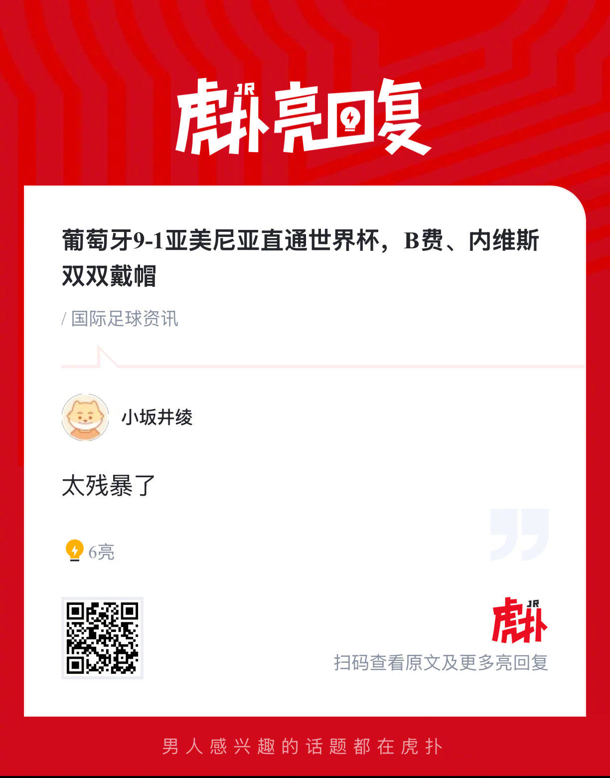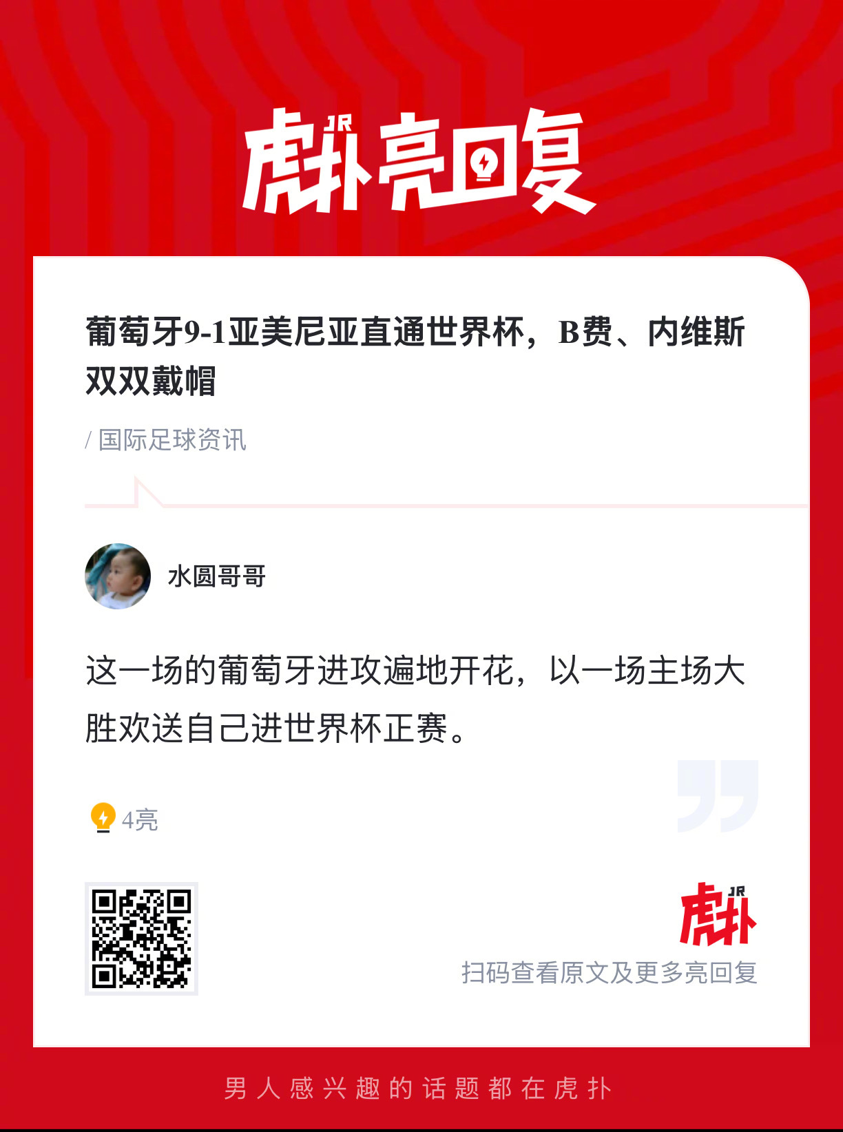 【葡萄牙9-1亚美尼亚直通世界杯,B费、内维斯双双戴帽】上半场,维加补射破门首开记录,斯佩茨扬后点包抄破门扳平,拉莫斯推射空门再度领先,内维斯连入两球梅开二度,坎塞洛中柱,维加造点、B费点射破门;下半场,B费低射破门双响,博尔赫斯造点、B费主罚戴帽,内维斯垫射破门戴帽,孔塞桑补时破门。