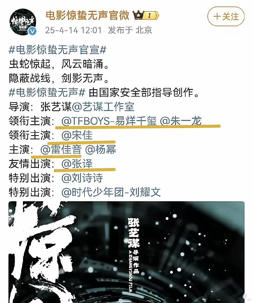 金鸡奖过后,张艺谋完成了《惊蛰无声》最后一块拼图。看看《惊蛰无声》演员阵容:易烊千玺、雷佳音、朱一龙、宋佳和张译,四位影帝加一位影后,还有杨幂、刘诗诗两位流量大花。能把这么多影帝影后聚在一起,内地电影圈里只有老谋子做得到了。《惊蛰无声》易烊千玺、朱一龙一起飙戏,一个充满锐气,一个成熟稳重,是不是很期待呢?