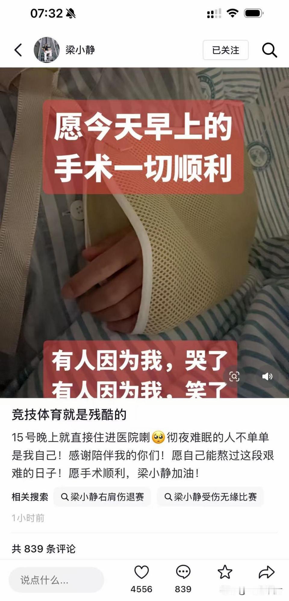 在全运会男女混合4X100米接力决赛交接棒时意外摔倒的28岁广东短跑名将梁小静更新了个人社交平台内容,透露她被查明是右肩锁骨断了,将接受手术治疗。她写道:“有人因为我,哭了;有人因为我,笑了。”她还写了一行字,“竞技体育就是残酷的”,还标了粗体。当时她与临时被排到第一棒的队友朱翠妍交接棒时,疑似腿部出现碰撞,直接前扑摔倒,今年5月在广州进行的世界田联接力赛女子4×100米接力预赛,梁小静就曾在与葛曼棋的三四棒交接时意外摔倒。比赛结束后,穿着不同颜色队服的选手们都围拢到她身边问候,画面很感人。