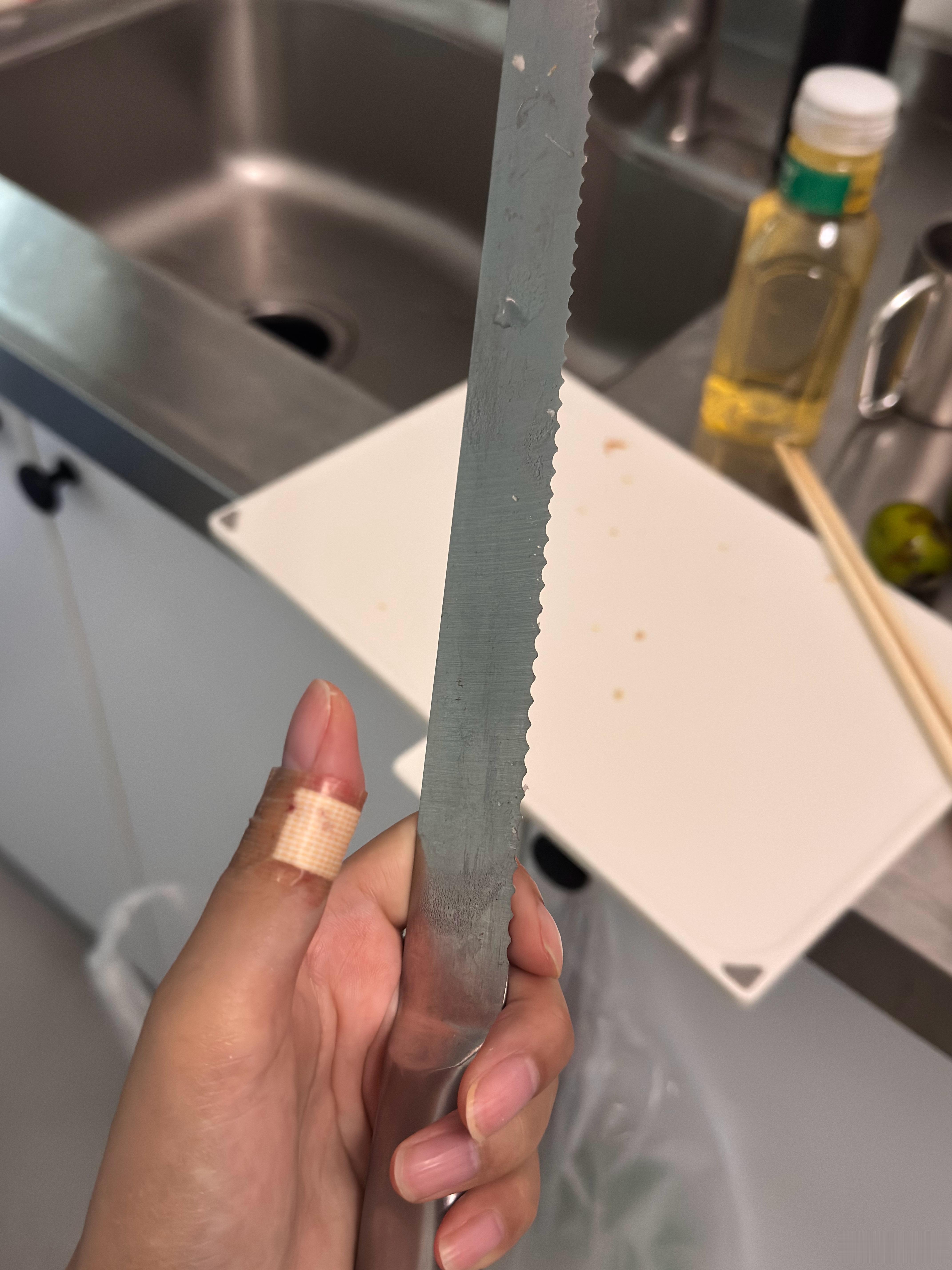 大家要小心这种面包刀,看着不锋利,没想到割的伤口还挺深,痛死了