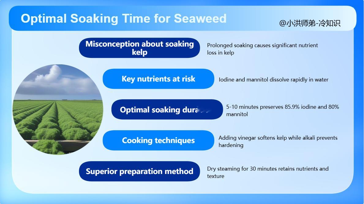 海带在水中浸泡越长越好很多人在制作海带菜时,喜欢把海带泡在水中几个小时。其实这样做是很不科学的,会损失许多营养成分。海带中含有多种营养成分,碘和甘露醇多附在表面,如果干海带在水中浸泡过久,营养物质就要大量损失。据研究,干海带浸泡15分钟后,有85.9%的碘溶于水中,浸泡40分钟,80%的甘露醇被溶解。若浸泡几小时或几天以后,营养物质几乎全被溶掉了,剩下的只是海带胶和纤维素。因此,干海带不要用水久泡。浸泡海带一般以5~10分钟为宜,在浸泡海带的水中放一点醋可使海带泡软,但是泡开的海带在炖煮时会发生越煮越硬的现象,有时炖1小时仍然很硬。此时,加少许碱或小苏打即可煮烂。另外,最好的办法是在食用海带时,首先干蒸,即将干海带打开放入笼屉里蒸30分钟再清洗。这样既避免泡不软、煮不烂的发生,又保住了海带的营养。|||