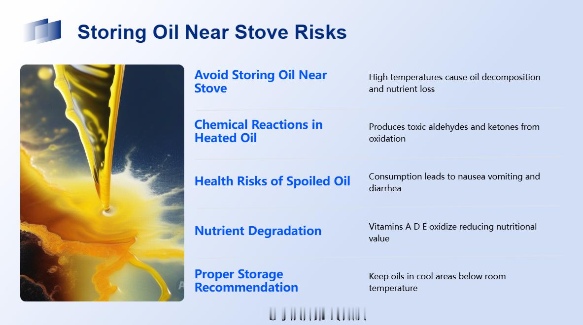 食用油可以放置灶旁不少家庭出于烹调方便的考虑,总喜欢将食用油放置在灶旁。其实这种做法不仅不可取,而且十分有害。炉灶旁温度较高,油脂长时间受热,就会发生分解变质。油脂分解出的亚油酸易与空气中的氧发生化学反应,产生醛、酮和其他的有毒物质。人食用这种油,会出现恶心、呕吐、腹泻等症状。同时,食用油会受高温影响,油脂中所含的维生素A、维生素D和维生素E等均被氧化,降低了营养成分。因此,食用油最好放在室温较低的地方保存。|||