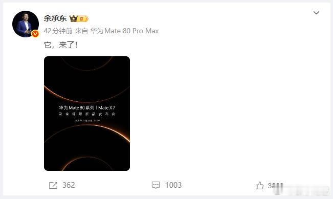 华为 Mate 80 和 Mate X7 官宣了!11 月 25 日 14:30 发布,传闻已久的 Pro Max 机型也正式确认。而且 Mate 80 的外观,余总也直接放出来了,又回归类似 Mate 60 的星环设计,但是背板上多了一个同样星环设计的磁吸环,这个外观你觉得怎么样?除了这些,大家还有什么期待吗?