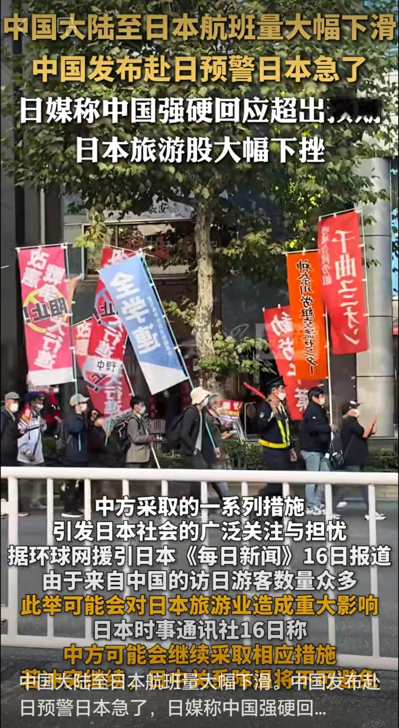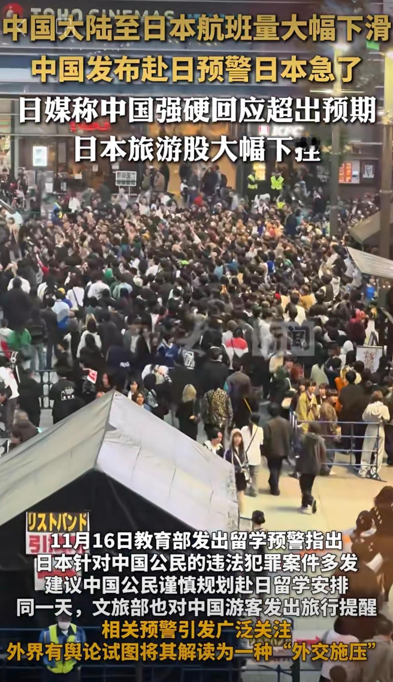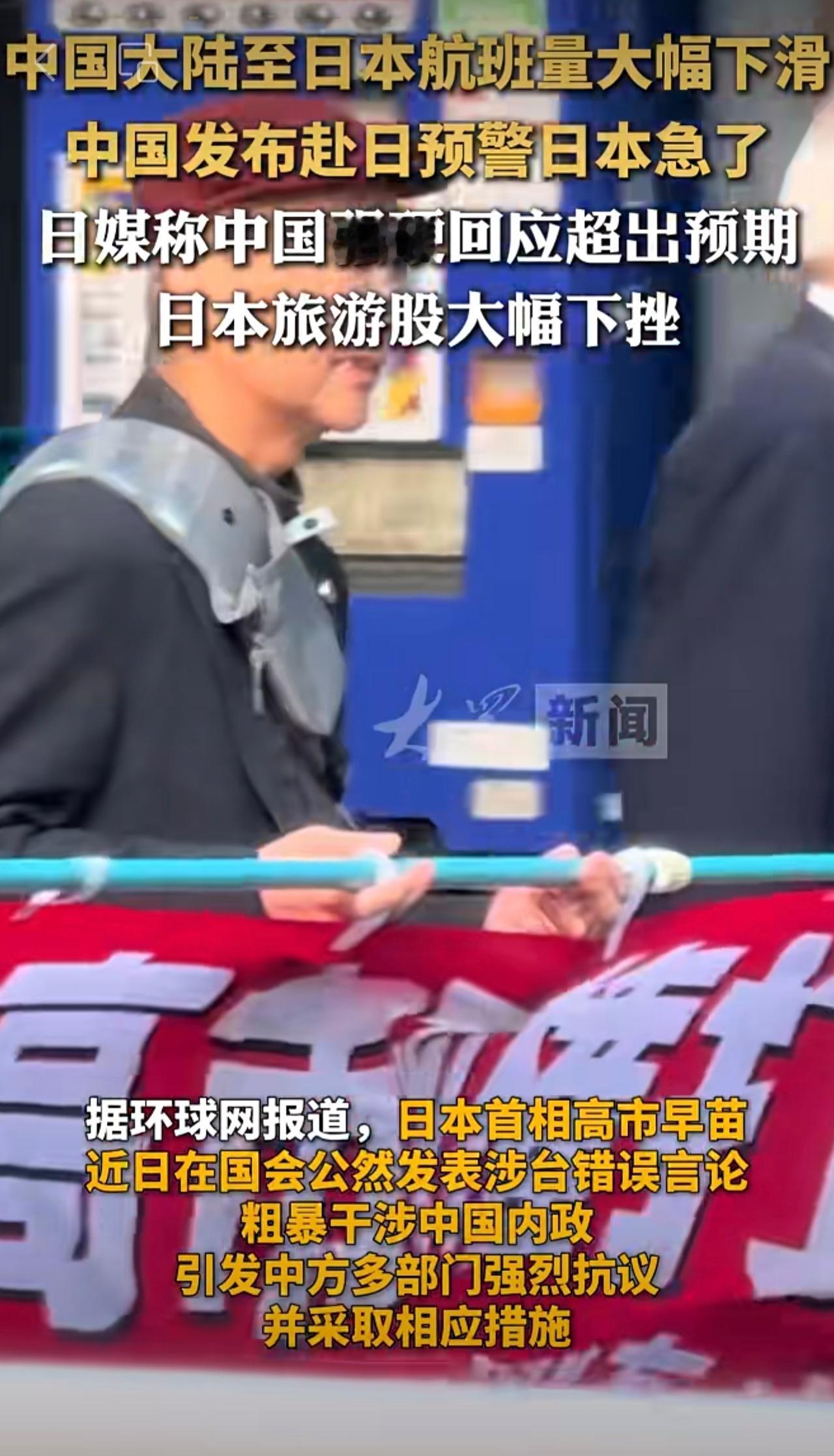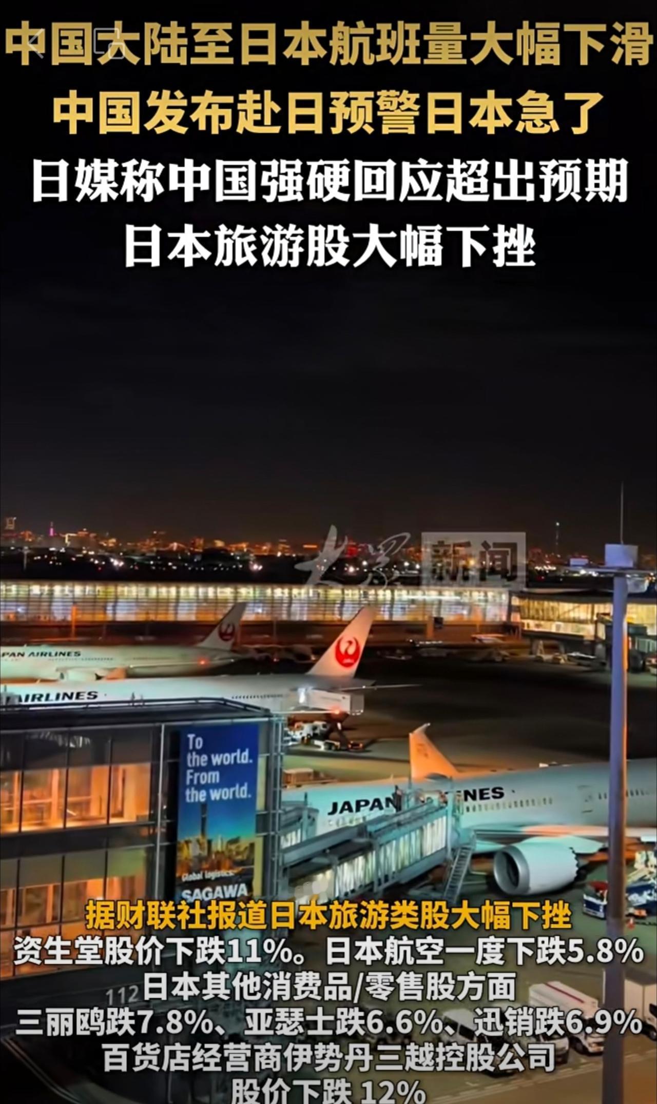 中国大陆至日本航班量大幅下滑。中国发布赴日预警日本急了,日媒称中国强硬回应超出预期。日本旅游股大幅下挫。(环球网 财联社)