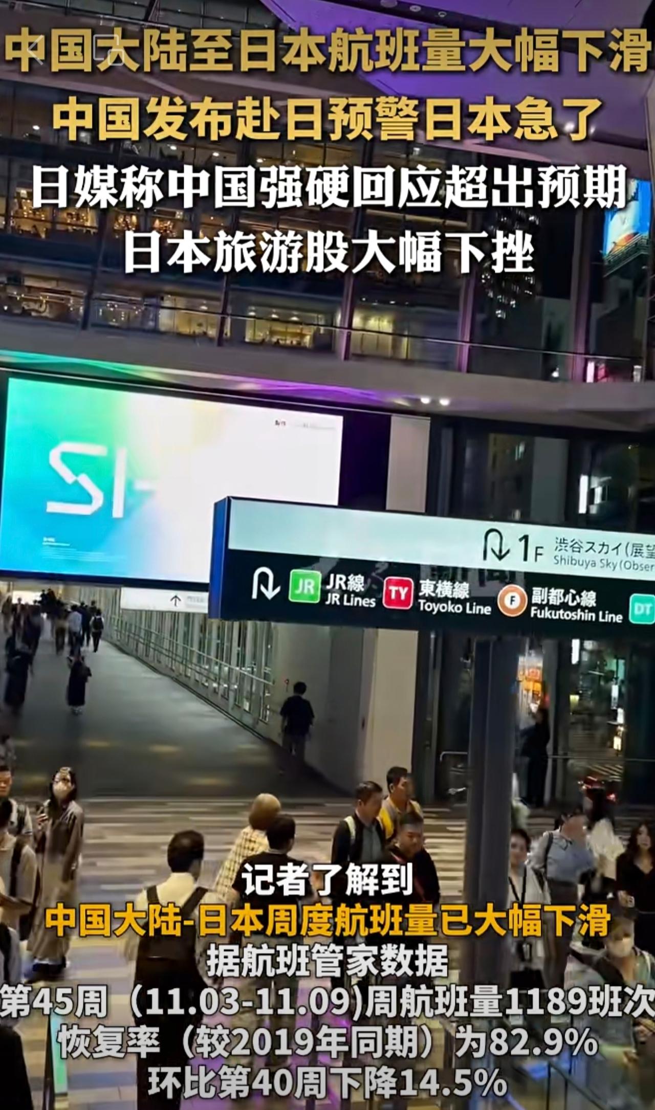 中国大陆至日本航班量大幅下滑。中国发布赴日预警日本急了,日媒称中国强硬回应超出预
