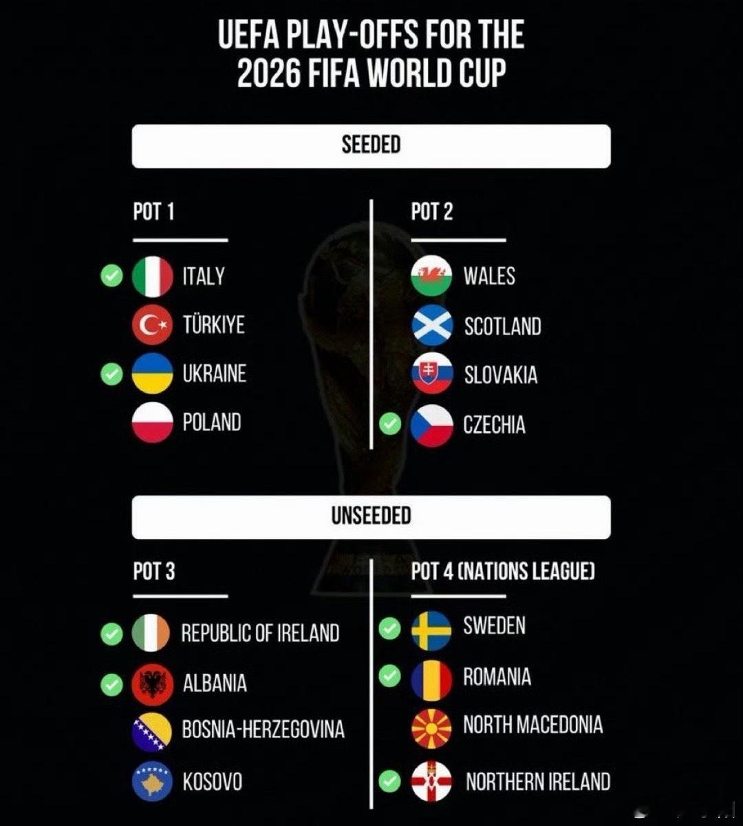 世界杯和欧洲杯冠军意大利队,又㕛要去打附加赛了。要知道前两届附加赛,意大利可都没出线。意大利队这次世预赛到现在的18分,放在其他有些小组可能就是第一了。但谁知道他们遇到了已经杀疯的哈兰德和挪威队。别看挪威队现在世界排名是第29,但挪威队却和世界排名第1的西班牙以及世界排名第4的英格兰队一起,成为欧洲区预选赛到现在仅有的3支保持全胜的球队。挪威8场小组赛踢完全胜拿到了24分的满分。意大利队除了被挪威双杀的两场球之外,其余6场比赛也保持了全胜,但也只能去打附加赛。欧洲区附加赛的规则是,12个小组第二外加4支24-25赛季欧国联成绩最好的未获得世界杯或附加赛资格的球队将会进入附加赛,随后附加赛会分为4个小组进行,每组4队进行两场半决赛和一场决赛,最终决出4支晋级世界杯的球队。意大利已经确定可以进入附加赛抽签的第一档 他们将在主场迎战第四档四支球队中的一支(图四)。如果顺利过关,将会与另一场半决赛(第二档对阵第三档)的胜者争夺一个出线名额。而这次附加赛第4档的球队中。也不乏瑞典罗马尼亚这样的球队。附加赛半决赛时间初定于2026年3月26日,由排名较高的球队主场作战;决赛于3月31日在中立场地或抽签决定主场进行。 附加赛采取的是单场定胜负的残酷赛制,看看意大利这一次是继续前两届附加赛的噩梦?还是最终能杀出一条血路进军世界杯。