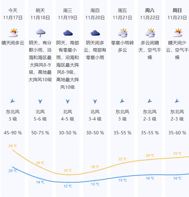 周一(17日)晴天间多云,气温20-29℃。受强冷空气影响,周二至周三(18-19日)阴天,有零星小雨,沿海、海区最大阵风8-9级,高地10级,最低气温降至12℃左右,体感显著转阴冷。周四至周五(20-21日)零星小雨转多云,气温逐渐回升,风力减小。周六至周日(22-23日)多云干燥。