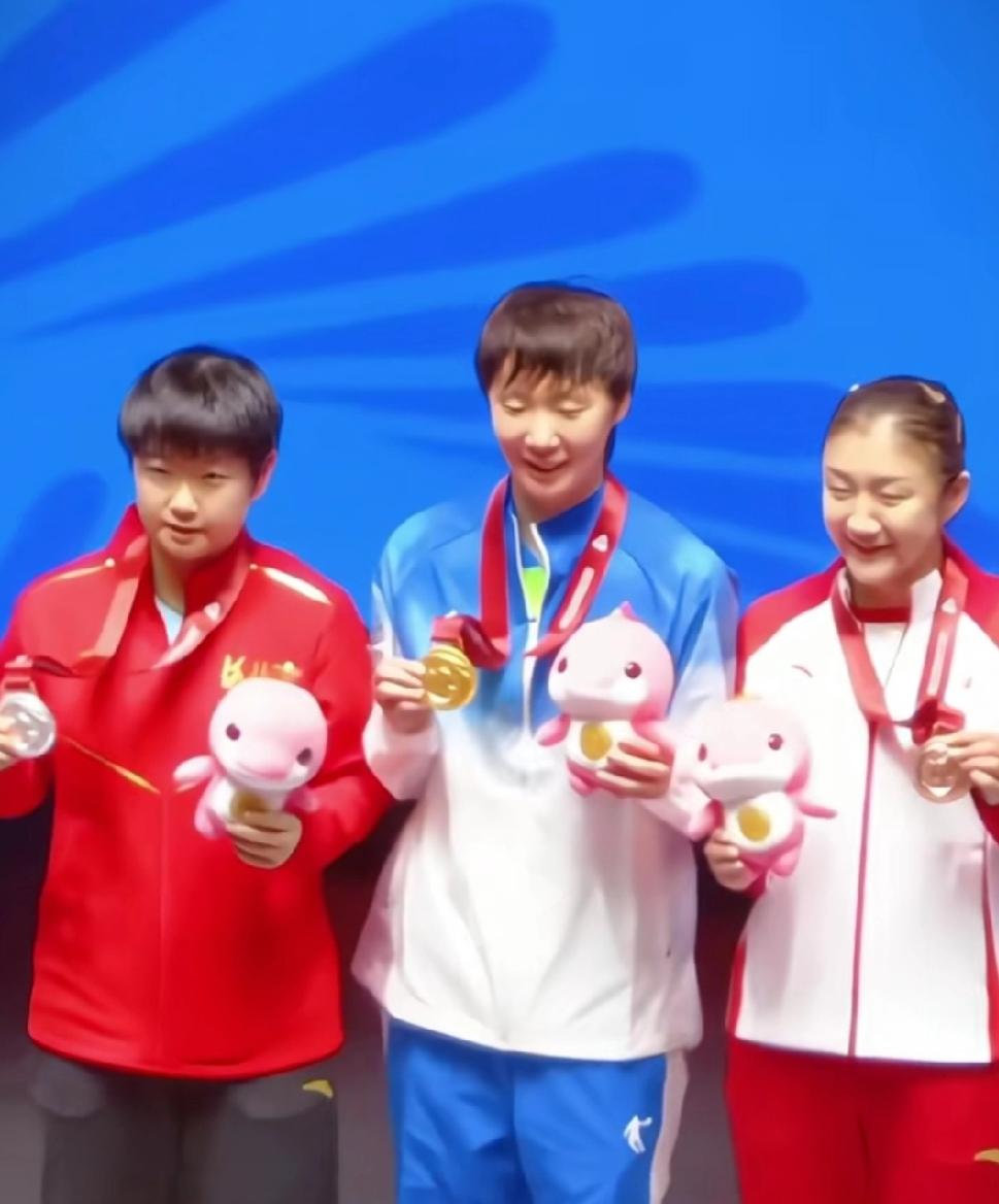 全运会乒乓球女单决赛结束,领奖台上孙颖莎、王曼昱、陈梦三姐妹同框合影留念。孙颖莎很实诚,满脸真诚地祝贺王曼昱夺金,这格局直接拉满! 我也是忍不住在瞎琢磨,竞技场上竞争那么激烈,冠军就一个,孙颖莎心里说不定也有点小遗憾吧。