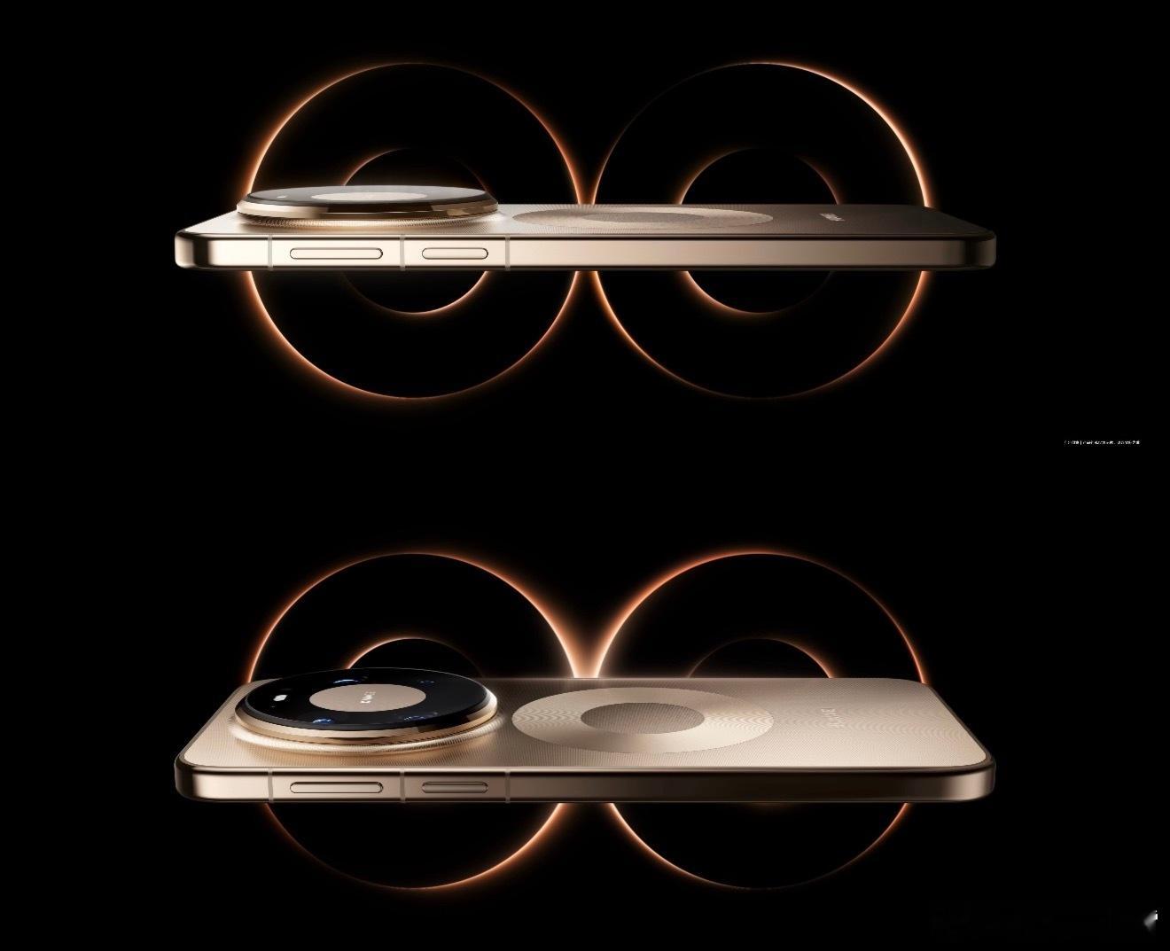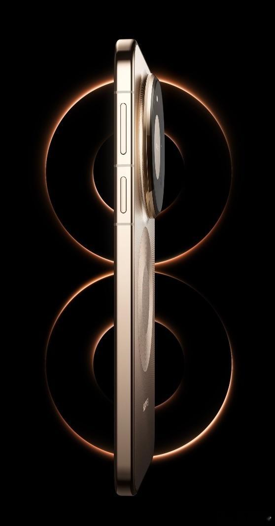 该说不说华子做质感还是毋庸置疑的,高亮直角中框搭配上这个金色看起来就挺贵气,据说用上了中框后盖金属一体化设计,而不是玻璃后盖,如果真这样的话那就有点东西了,意味着信号问题被华子彻底搞定。直屏 + 全新双环设计辨识度没话说,至于镜组下面的磁吸环,如果没猜错的话,我觉得华子还会带来更多新玩法,期待真机吗