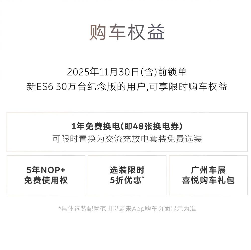 蔚来ES6 30万台纪念版上市:34.98万起,免费换电+NOP+管够! 30万台不是小数目,说明蔚来这用户基盘确实稳[666]。 新车整车购买34.98万元 / 电池租用24.18万元起。 提供1年免费换电(、5年NOP+免费使用权、选装限时5折! CLTC 纯电续航510km (75度电) / 650km (100度电)。 双电机360kW,700N·m,4.5秒破百! 搭载神玑NX9031芯片,单颗性能≈四颗旗舰芯片,算力这块儿拿捏了。 34.98万的起售价,配上这些权益和标配的女王副驾、20英寸轮毂,性价比直接拉满。 各位觉得这个ES6纪念版的“含金量”如何?[吃瓜群众]