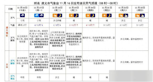 11月17日:阴天有小雨,局地中雨,有4~6级偏北风,气温大幅下降,伴有雨雾,夜间1400米以上高海拔地区有雨夹雪,伴有轻微凝冻及道路结冰,城区气温4~13℃;