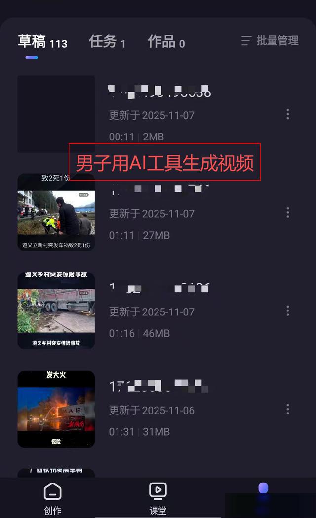 11月7日,杨某为博取关注,使用AI技术生成工具,在抖音平台连续发布两条内容不实的短视频,扰乱网络秩序,造成不良社会影响。