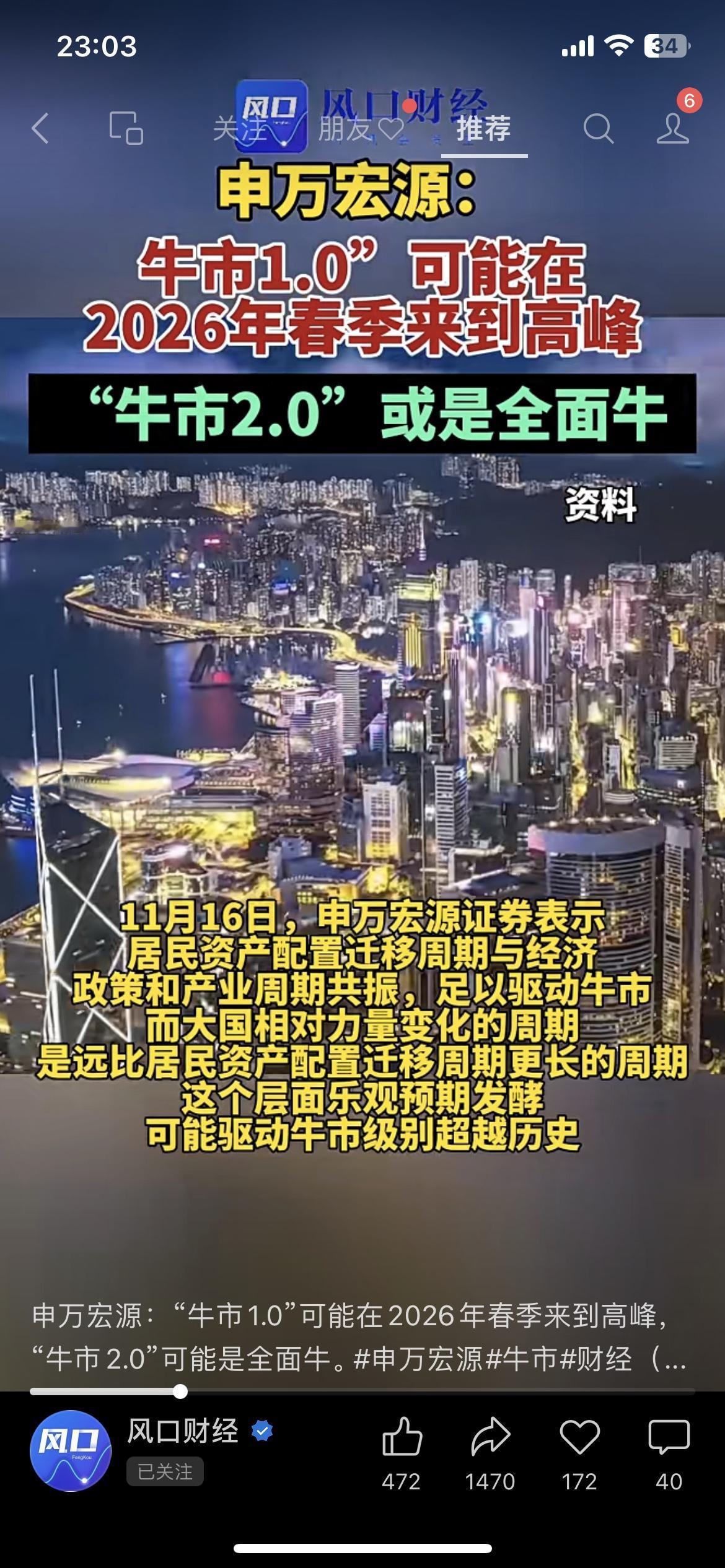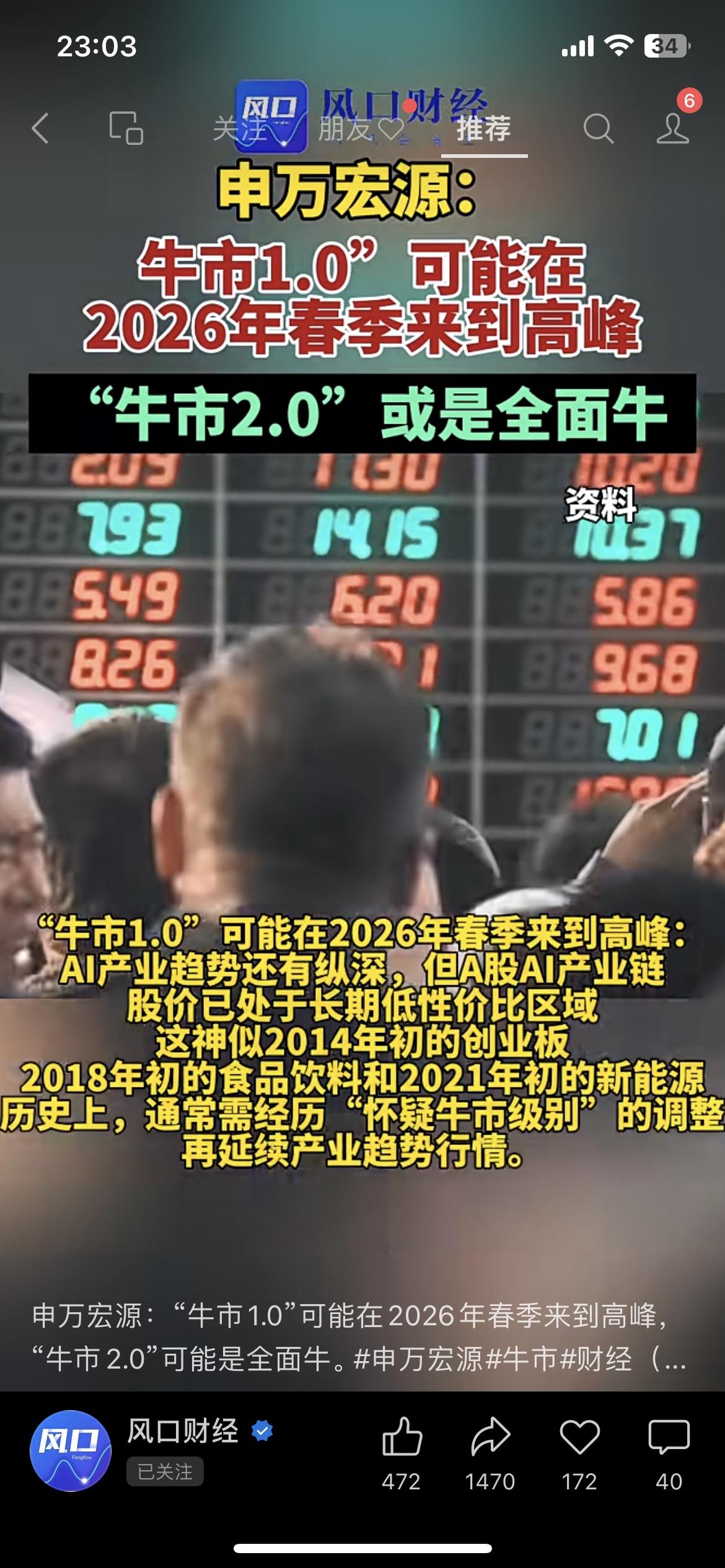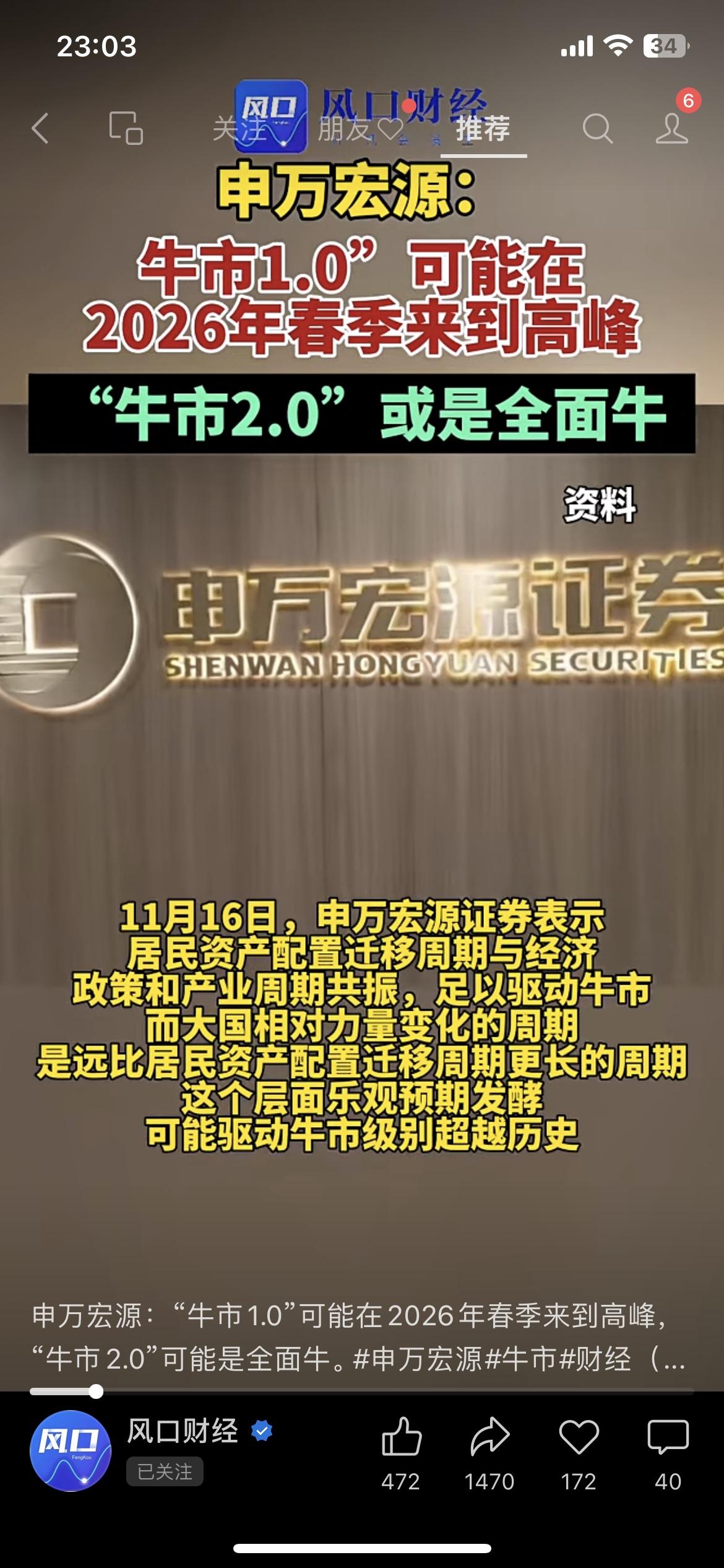 券商喊“牛市要爆了”!2026年先冲高峰,后面还有“全面牛”?散户能跟着吃肉不? 申万宏源刚放了个大消息:现在这波“牛市1.0”,可能2026年春天就到高峰了,等调整完还有“牛市2.0”,搞不好是“全面牛”那种! 他们说现在的情况,跟2014年创业板、2021年新能源那波特别像——居民钱往股市挪、政策和产业都凑一块儿发力,这劲儿能把牛市顶得比以前还猛。 咱散户听着是真心动,但就怕“牛市来了没赶上,套牢了跑不掉”。你们现在手里有票没?敢不敢等这波“全面牛”?评论区说说你的底仓!牛市 券商行情