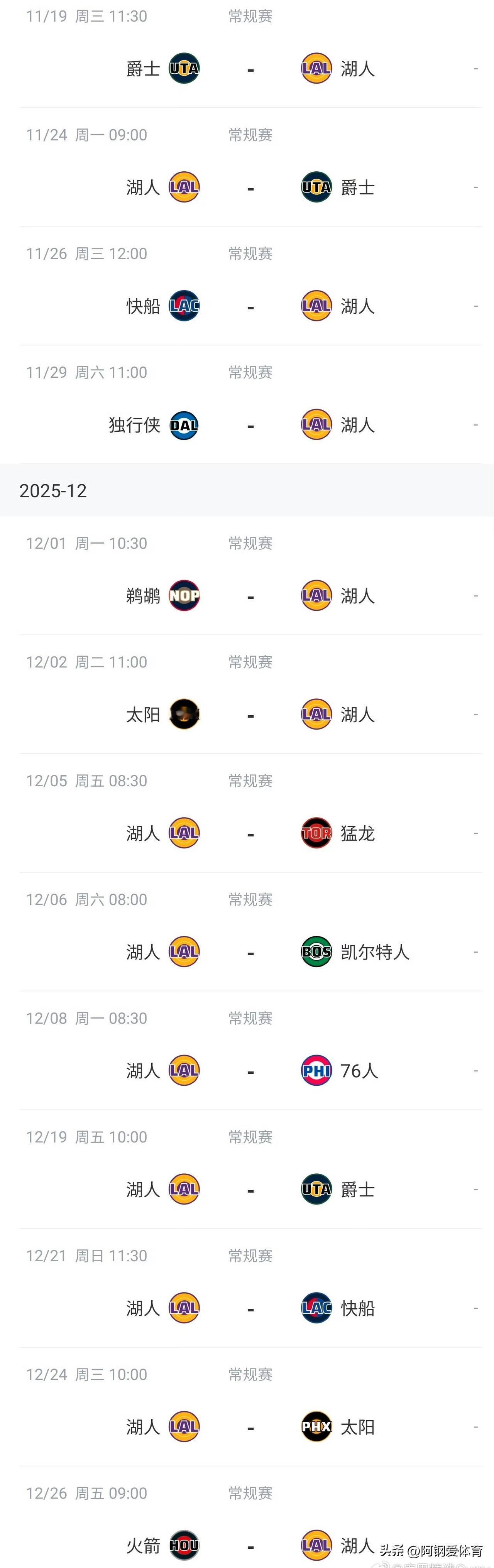 轻松!詹姆斯复出迎来超长轻松赛程,对手平均胜率41%[思考],赛程虽然简单,但是希望湖人一定要把握住机会啊 未来一个多月,湖人40天左右仅12场比赛,其中目前战绩最好的是8胜5负的太阳和猛龙,直至12月26日圣诞大战对阵强敌火箭。 ​​​这样的赛程对于复出后的詹姆斯而言,无疑是上天赐予的“福利局”。在这段赛程里,湖人有大把的时间去磨合阵容,詹姆斯也能逐步找回比赛状态。 对于太阳和猛龙,虽说他们目前战绩不错,但面对拥有詹姆斯的湖人,也并非稳操胜券。詹姆斯的经验和领导力,能让湖人队在场上迅速找到节奏。而且湖人的角色球员们,也会在这样相对轻松的赛程中,得到更多展现自己的机会。 在接下来的比赛中,我们可以期待詹姆斯会更多地去调动队友,让湖人的进攻变得更加多元化。而湖人的年轻球员们,也能在与这些实力并非顶尖的对手较量时,积累自信和比赛经验。 至于12月26日的圣诞大战,对阵强敌火箭必将是一场火星撞地球的对决。不过在那之前,湖人可以利用这段超长轻松赛程,调整到最佳状态,以饱满的姿态去迎接这场硬仗。让我们一起拭目以待,看看詹姆斯率领的湖人在这段赛程中能创造怎样的佳绩。