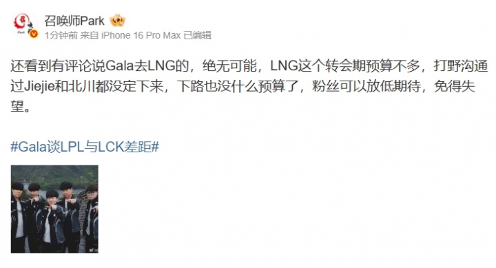 直播吧11月17日讯 今日,微博爆料人“召唤师Park”更博透露LNG的转会情况:看到有评论说Gala去LNG的,绝无可能,LNG这个转会期预算不多,打野沟通过Jiejie和北川都没定下来,下路也没什么预算了,粉丝可以放低期待,免得失望。
