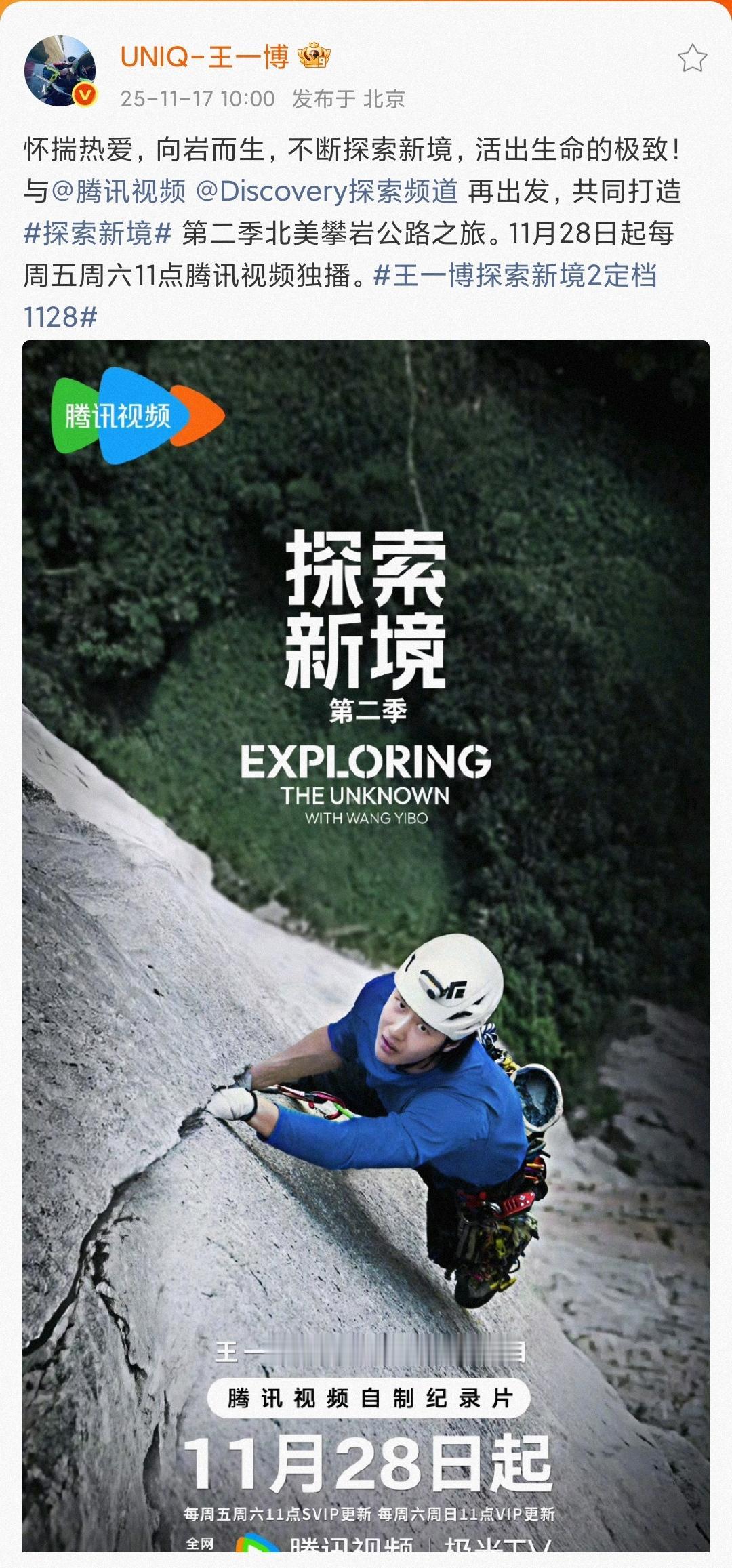 王一博《探索新境2》定档预告来了——北美攀岩。王一博连发两条vb,小狮子的兴奋开心溢于言表。 “让自己更活的像一个真实的人吧” “我在努力活出生命的极致” “找到了自己想要做跟喜欢做的事情,也就是攀岩,所以第二季我要去攀岩” “这才是我需要的生活” 豁达自由不受限,人生如旷野海阔天空…… 蓬勃向上的生命力,超级稳定又柔软可爱的内核,坚毅强大无坚不摧的大心脏,王一博的“酷”是真正酷到灵魂的酷,内娱“最有种的男人”,没有之一。 王一博探索新境2定档
