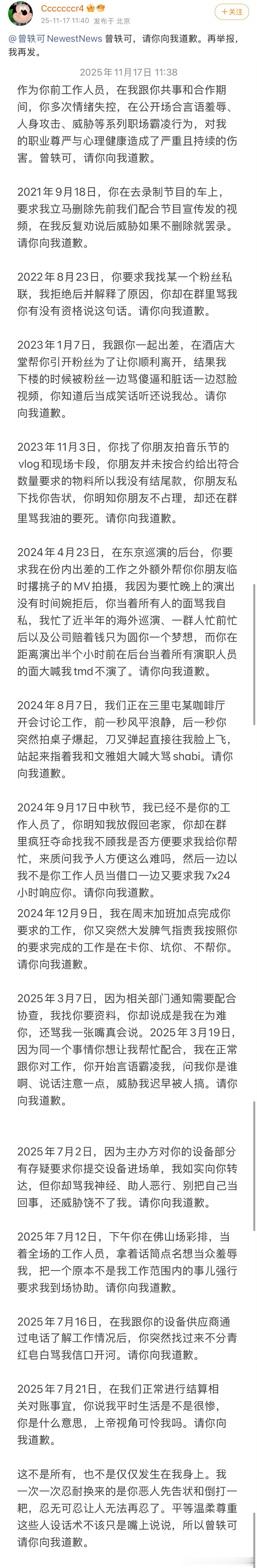 微博用户“Cccccccr4”自称曾轶可前工作人员发长文控诉曾轶可职场霸凌、演出开始前半小时彪脏话罢演威胁、私联粉丝后,疑似曾轶可现任助理发朋友圈对质。对此,前工作人员回应:“不好意思,要对质来微博对质,大家连好友都不是,你发的朋友圈我看不到。两方目前都是纯文字爆料。