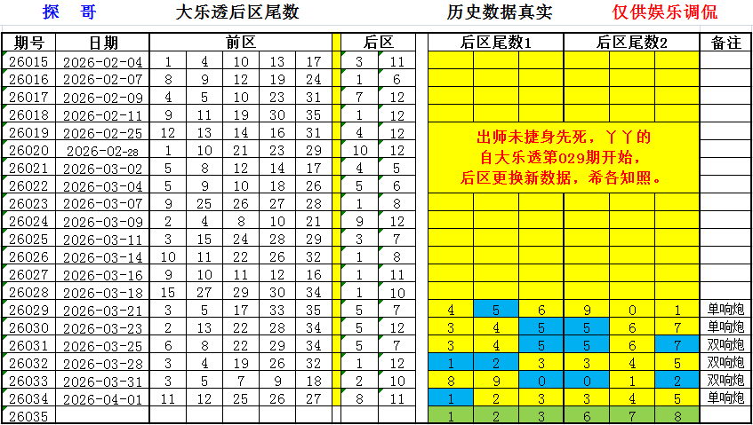 自大乐透第029期开始, 后区尾数更换新数据,希各知照。