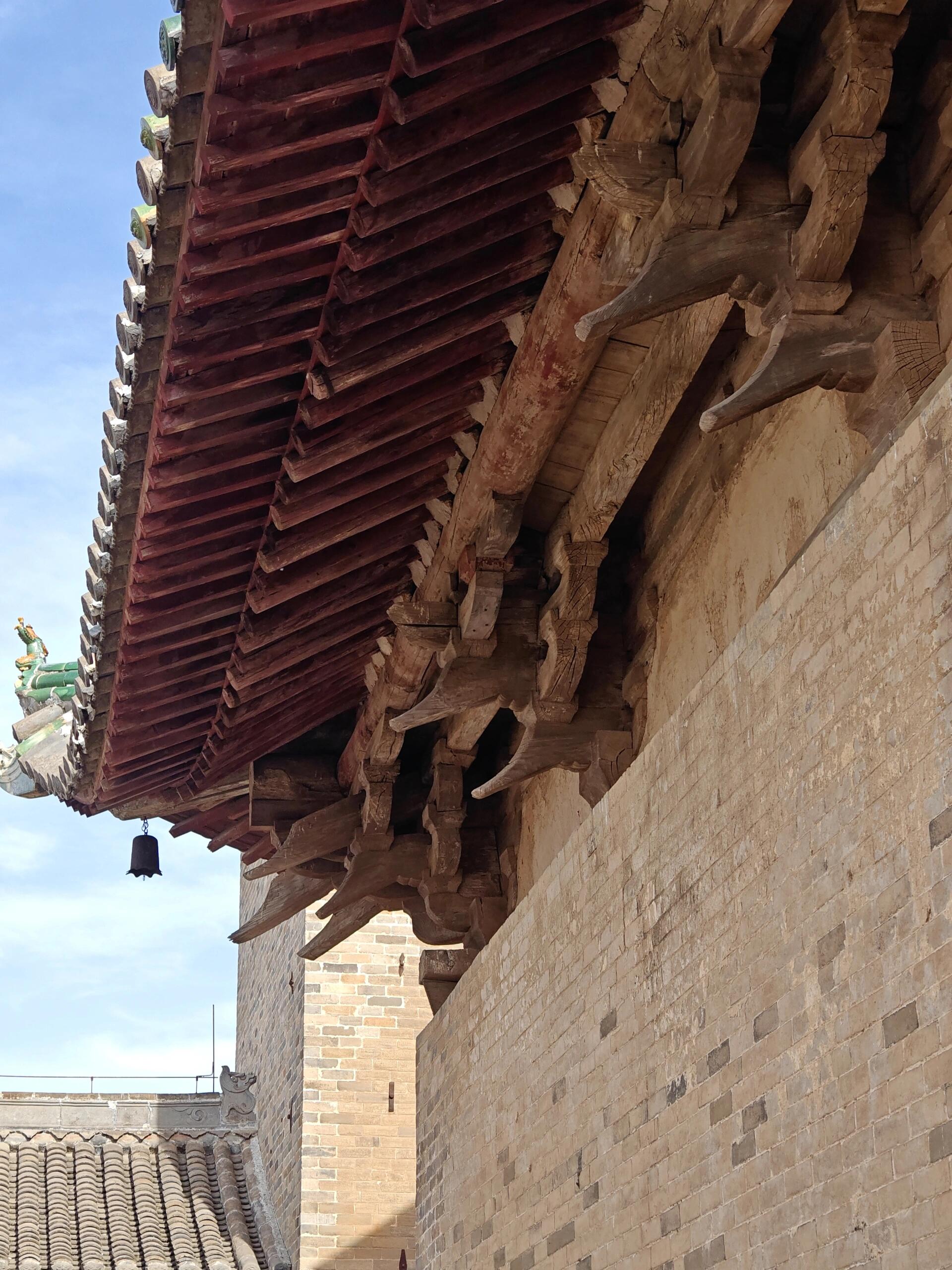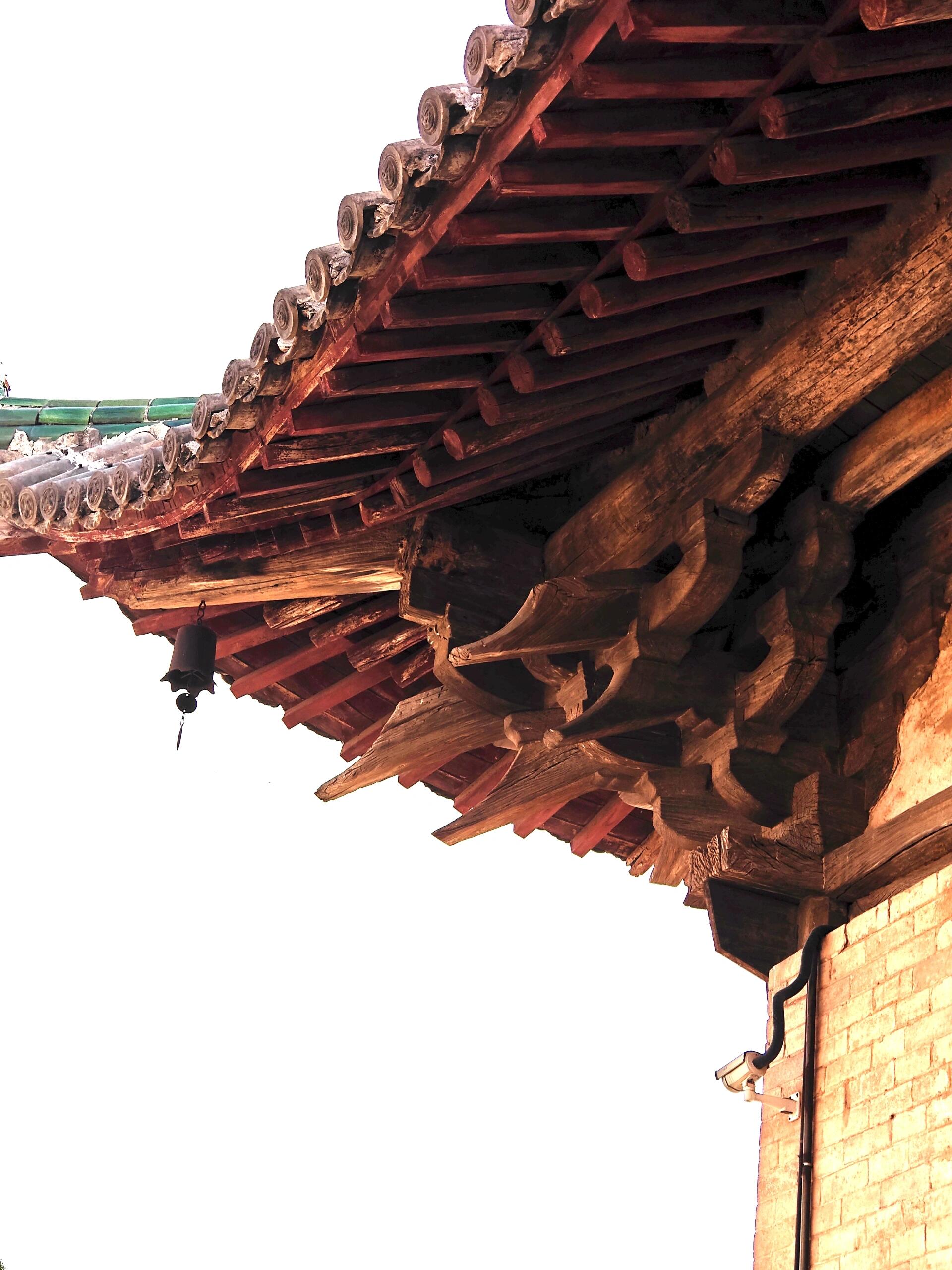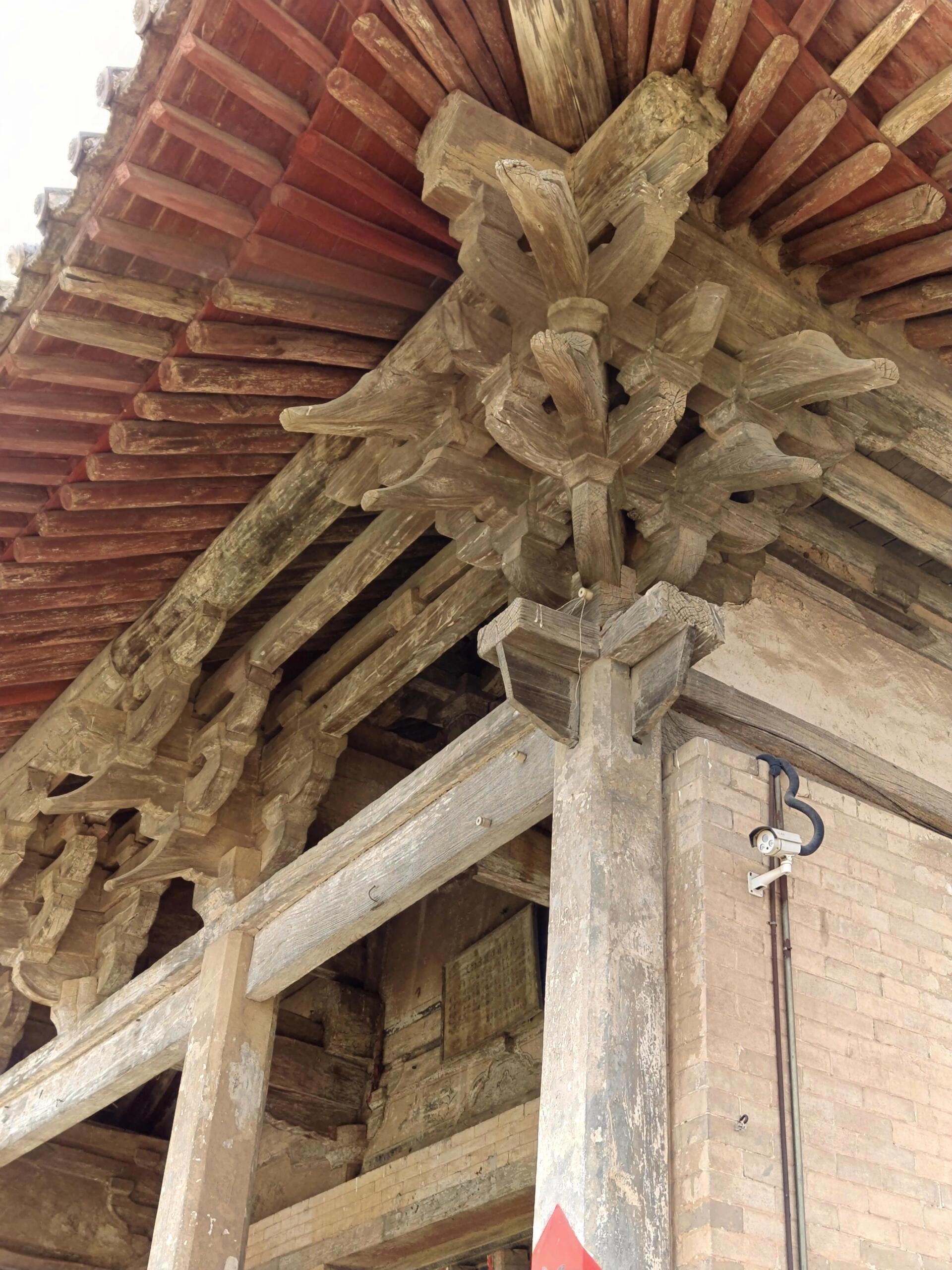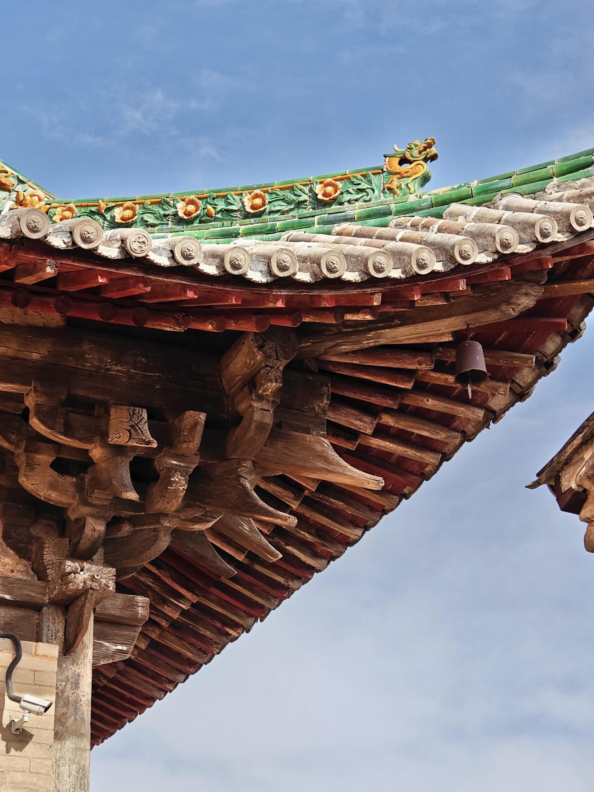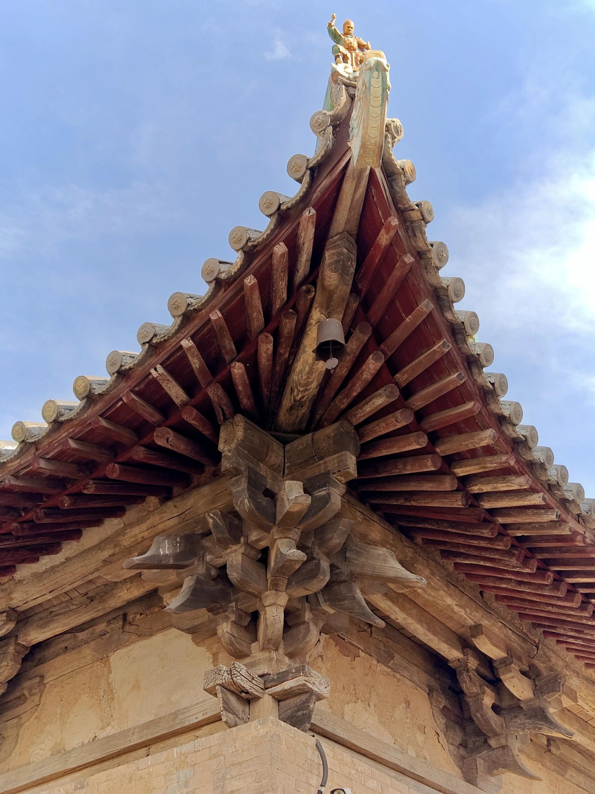 殿内梁架采用四椽栿对乳栿用三柱的结构,形如一架横置的古琴。抬头望去,驼峰与蜀柱在梁间构成几何图案,襻间斗拱像一串凝固的音符。单檐歇山屋顶的举折平缓,出檐达1.8米,宽大的飞檐在檐角处向上扬起,形成一道饱满的弧线。这种做法源自《营造法式》中的“生起之制”,却在金代匠人的手里多了几分旷野之气。