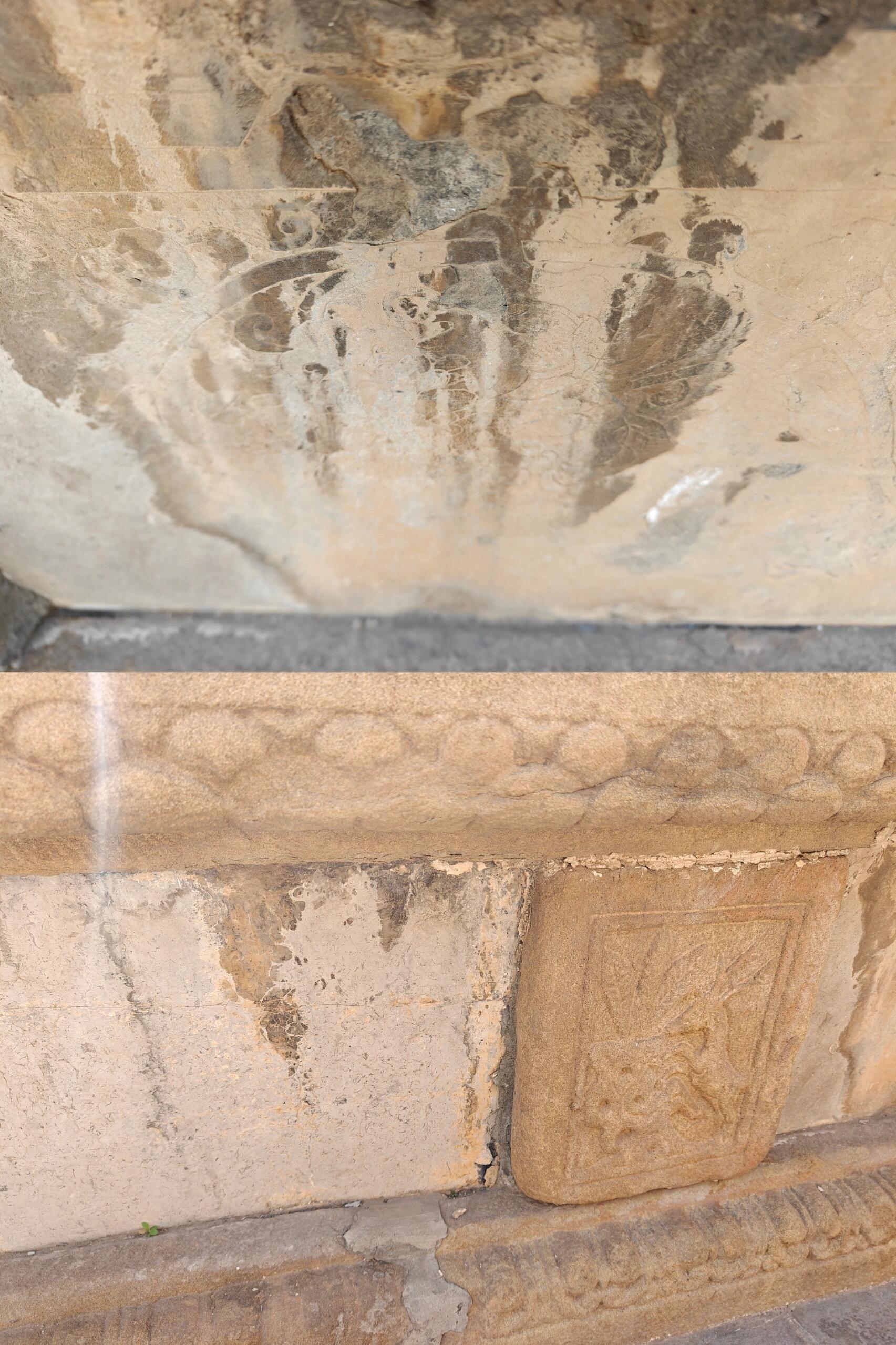 月台中央曾有献殿的柱础痕迹,四个石臼呈正方形排列,臼底还留着木柱腐烂后的炭化痕迹。想象当年,祭祀的供品摆在献殿内,香烟从敞廊飘出,缭绕在“晋城县莒山乡司徒村众社民施门一合”的门楣题记上,那些凿进石门楣的字迹,便在青烟中有了温度。