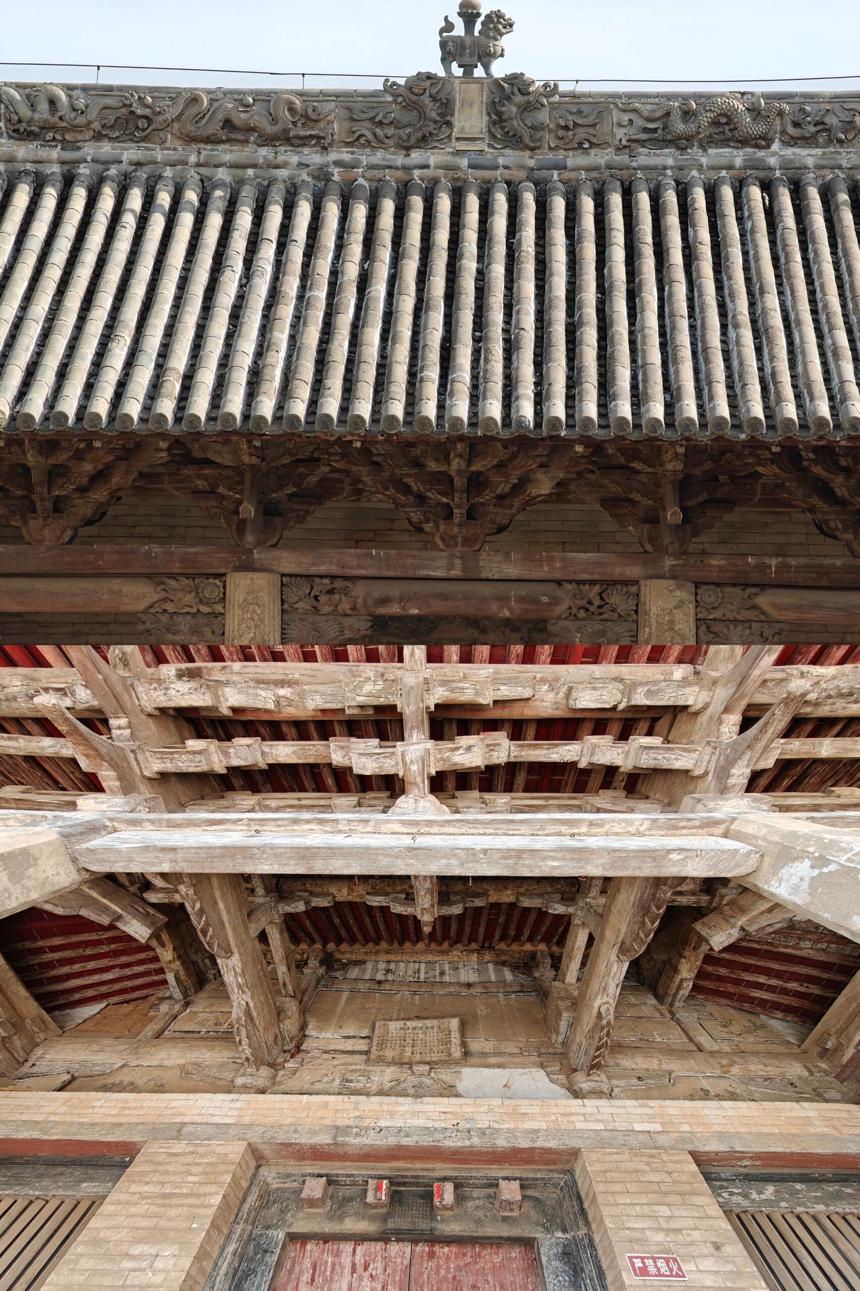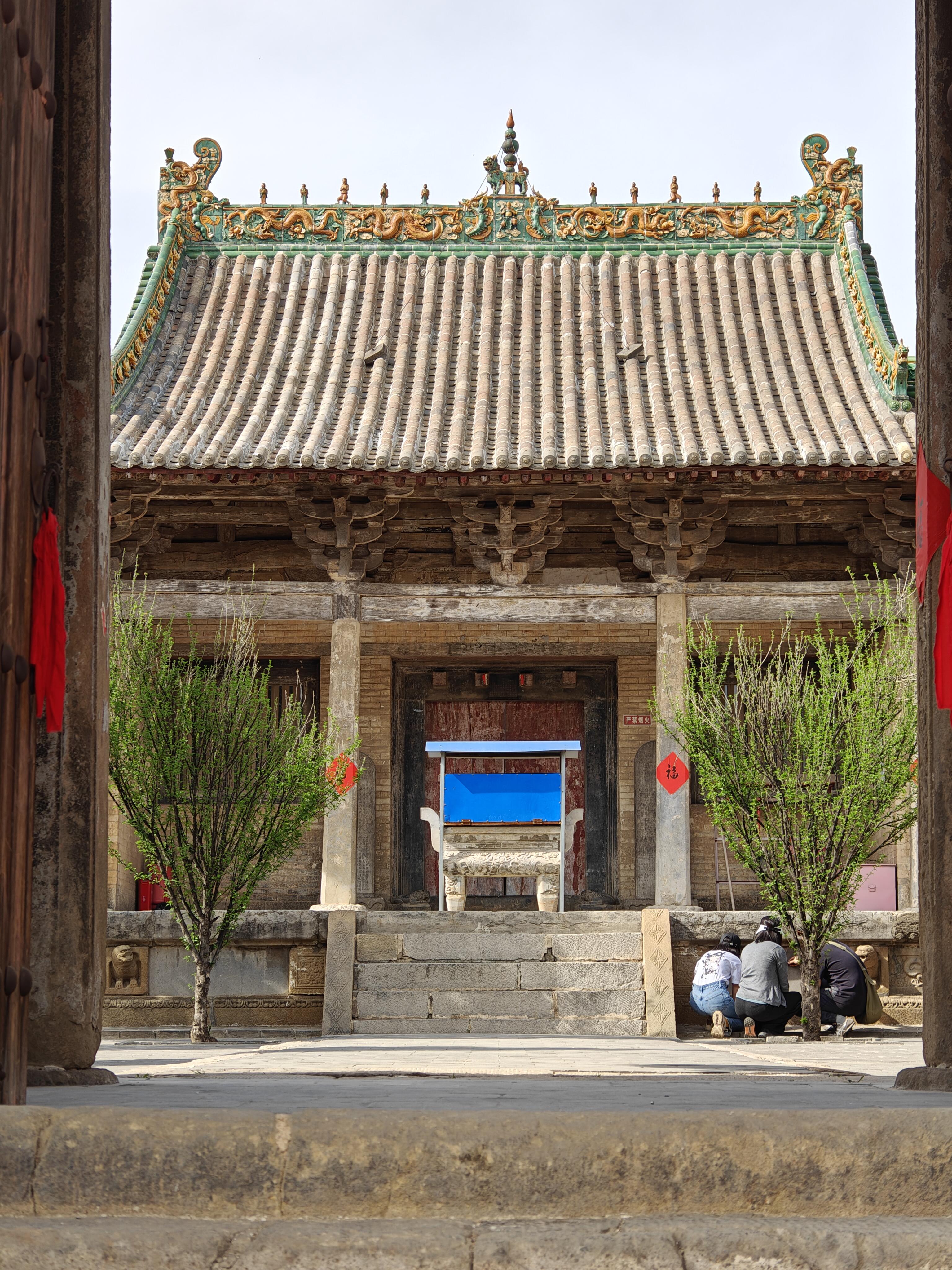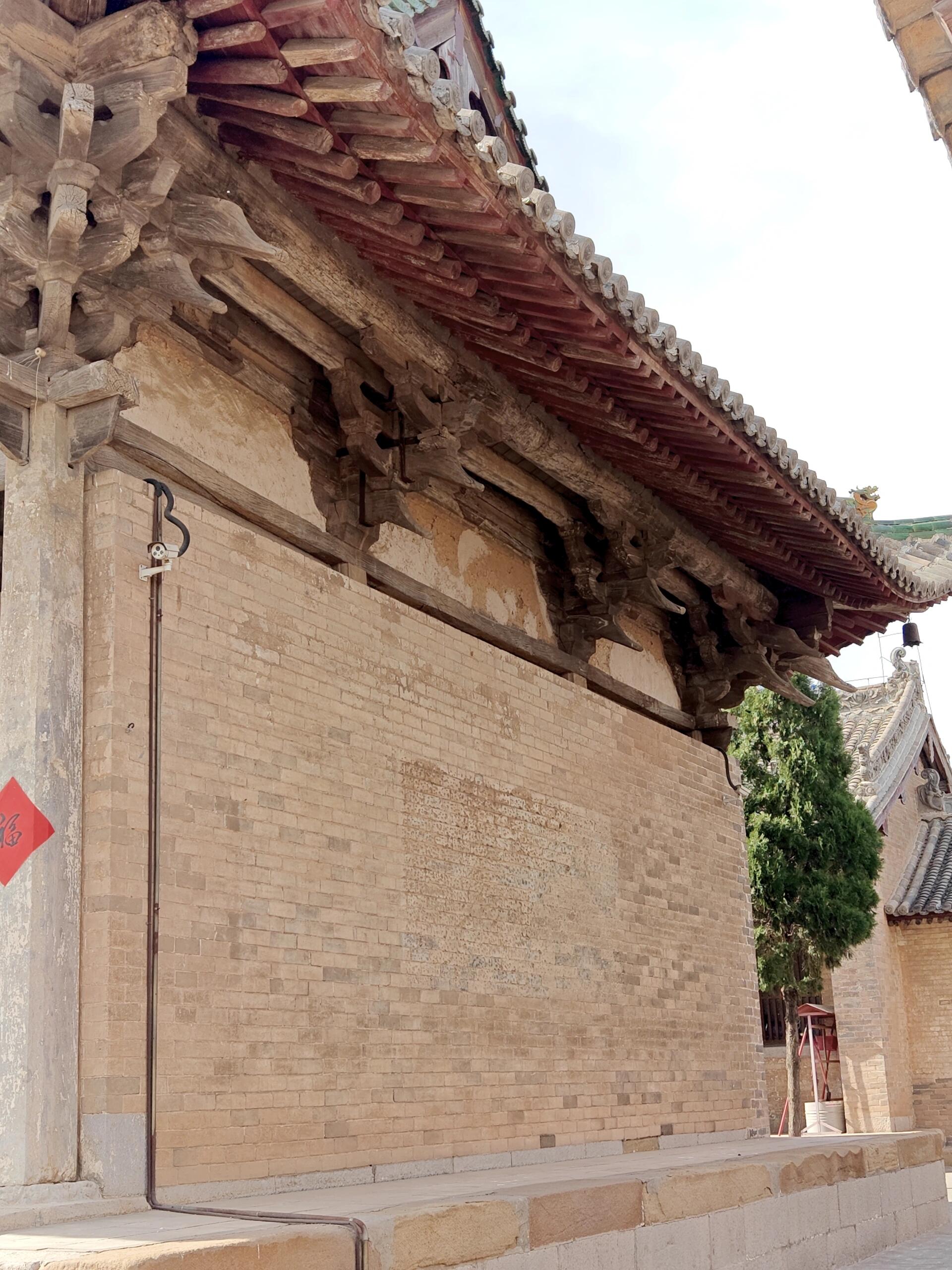 庙墙圈住的不只是建筑,更是八个世纪的光阴。长方形的院落东西宽32.85米,南北深84.76米,两进格局像一本翻开的线装书。山门三间悬山顶建筑挑着檐角,斗棋在檐下织成密纹,两翼砖墙用蓝灰色砖块砌出鱼鳞般的纹路。门楣上的砖雕已被风雨啃出细痕,却仍能辨出清代重修时的凿痕——那些深浅不一的刻痕里,藏着不同时代工匠的呼吸。