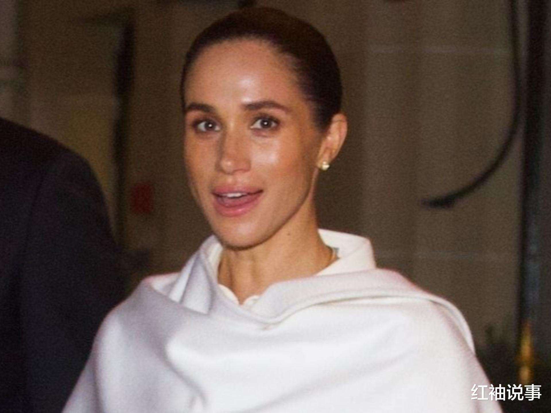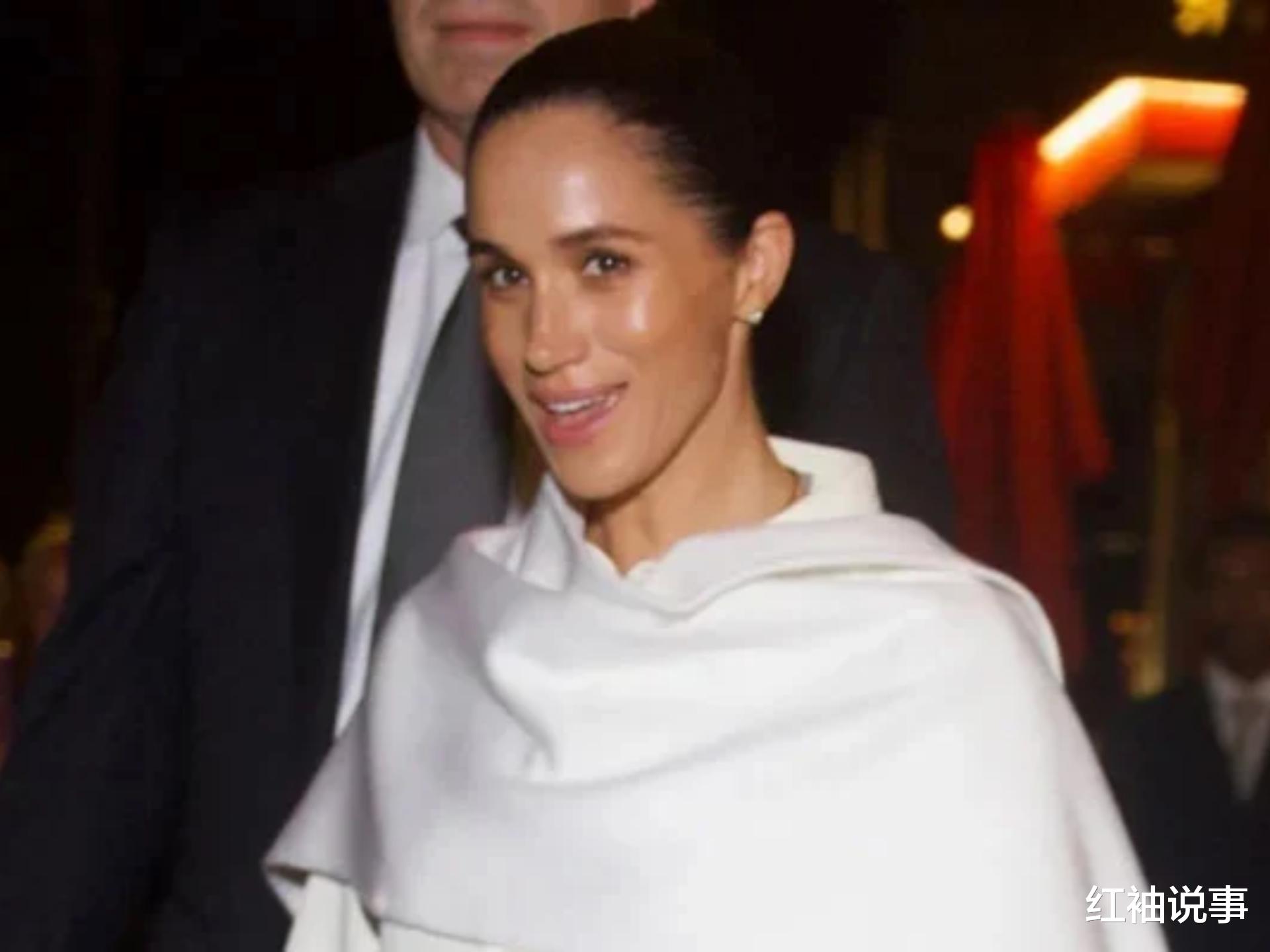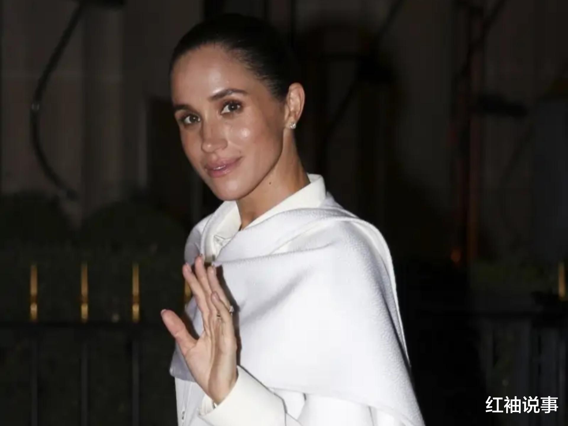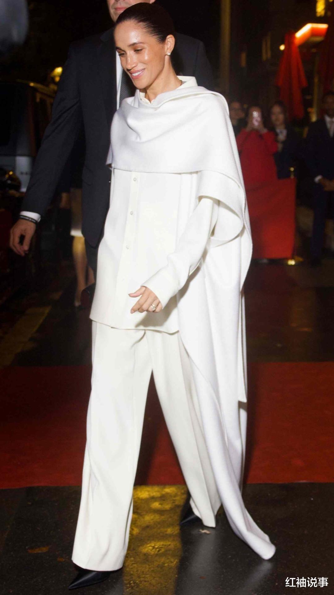 她身着一袭白色超大斗篷,内搭同色系纽扣衬衫,斗篷的戏剧性设计如长尾般垂落在身后,搭配白色阔腿裤,整体造型简约而大气。梅根以黑色尖头高跟鞋点缀浅色服装,头发则梳成光滑的低发髻,尽显优雅干练。她手提一个黑色精致小包。