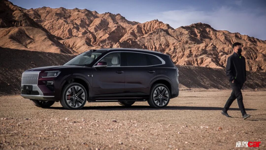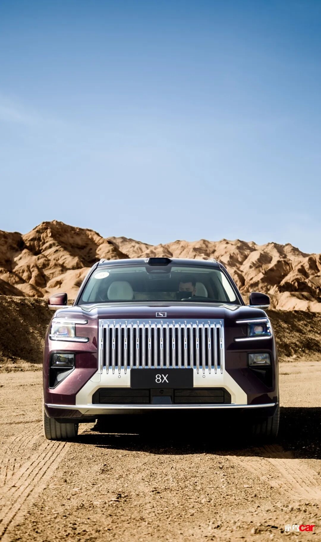 在敦煌看到极氪8X几乎毫无违和感,它并没有那种刻意张扬的攻击性。反而是从容。这种从容,来自比例。超过5米的车长与3069mm轴距,让整台车在视觉上更接近传统大型豪华SUV的体量 。但不同的是,它没有刻意拉长的修饰,而是通过更收敛的线条,把力量压在车身内部。