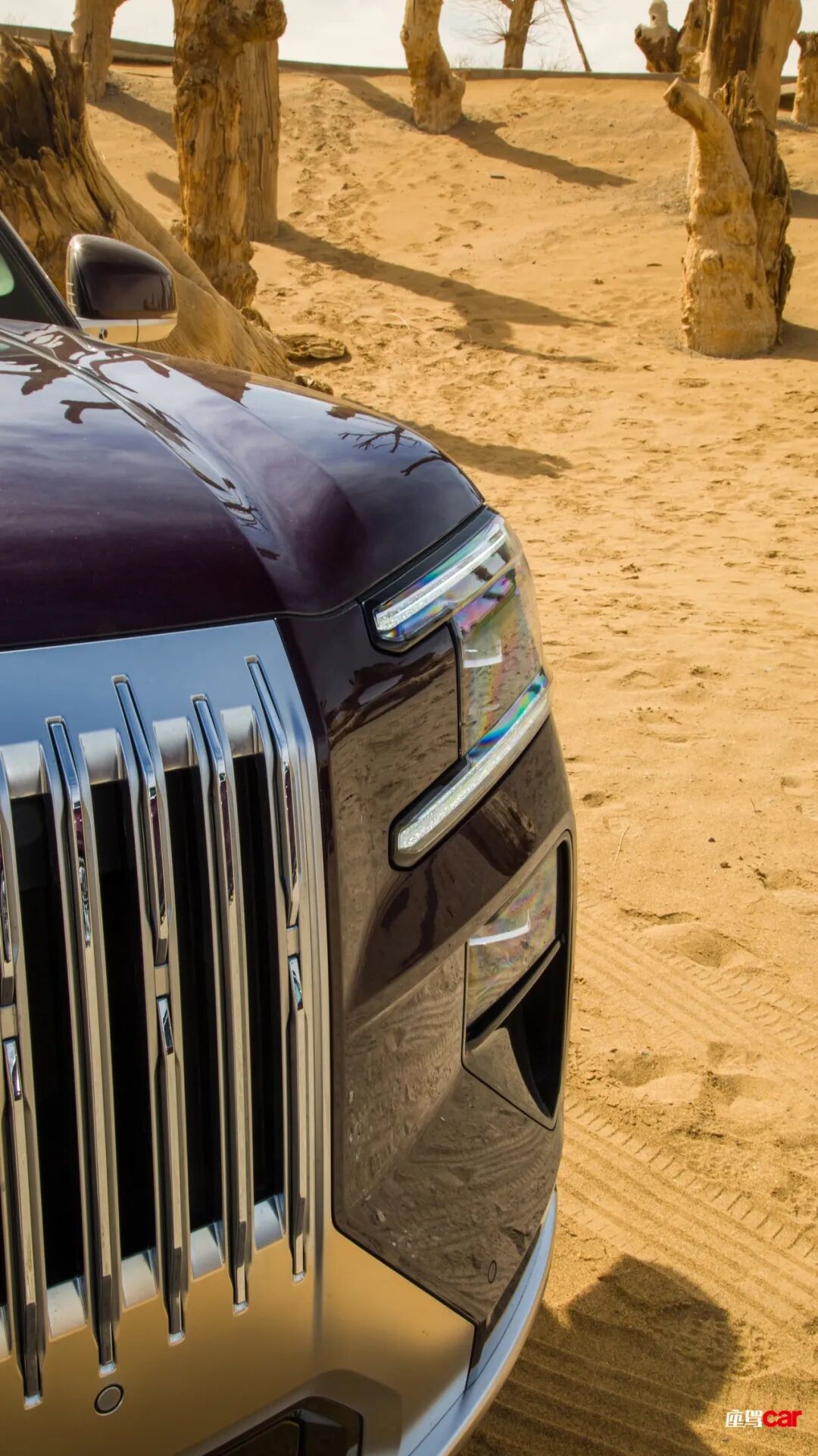 车头的一体式直瀑格栅,是一个很典型的例子。灵感来自东方建筑中台基的层级结构 ,视觉上是向下延展的重量感,而不是向前攻击的侵略性。在敦煌这种几乎没有参照物的环境里,这种设计反而更成立——它像一块被风打磨过的岩石,而不是一件被雕刻出来的工业品。